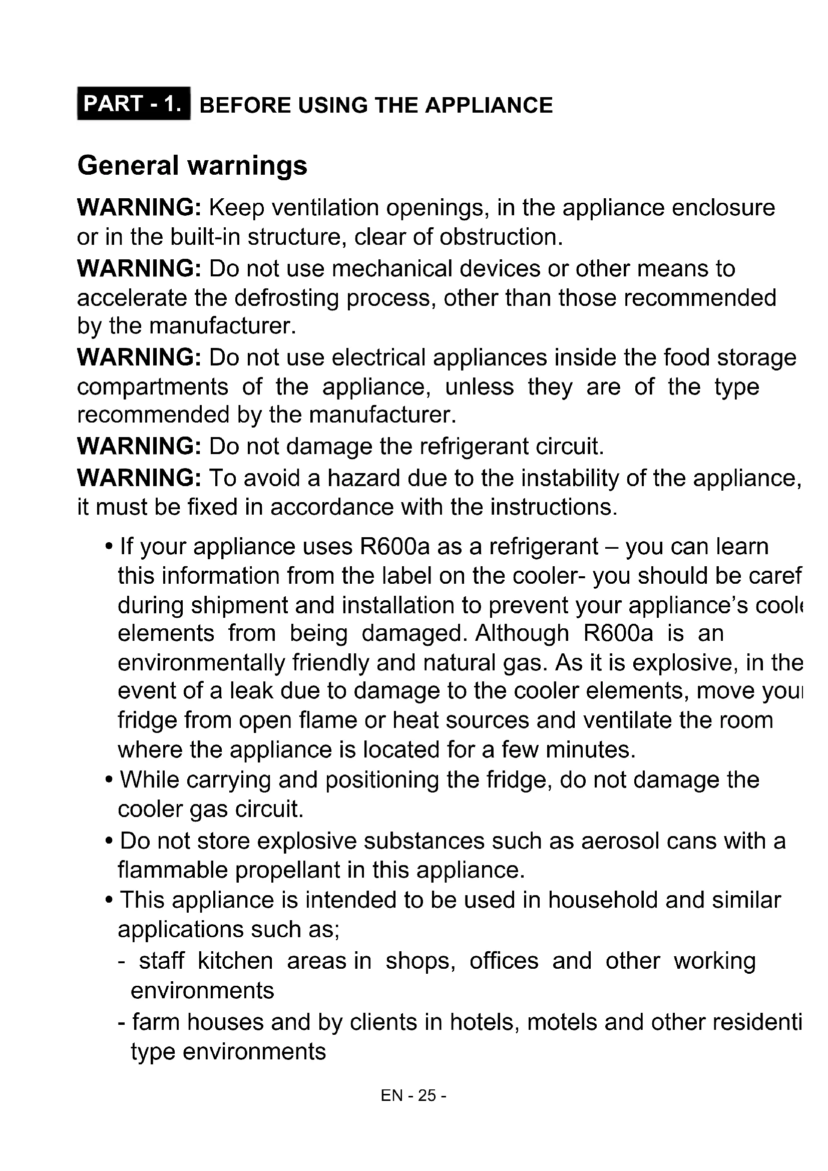 - This appliance is produced to be used in houses and it is only suitable for cooling / storing foods. It is not suitable for commercial or common use and/or for storing substances except for food. Our company is not responsible for the losses to be occurred in the contrary case.EN - 28 -