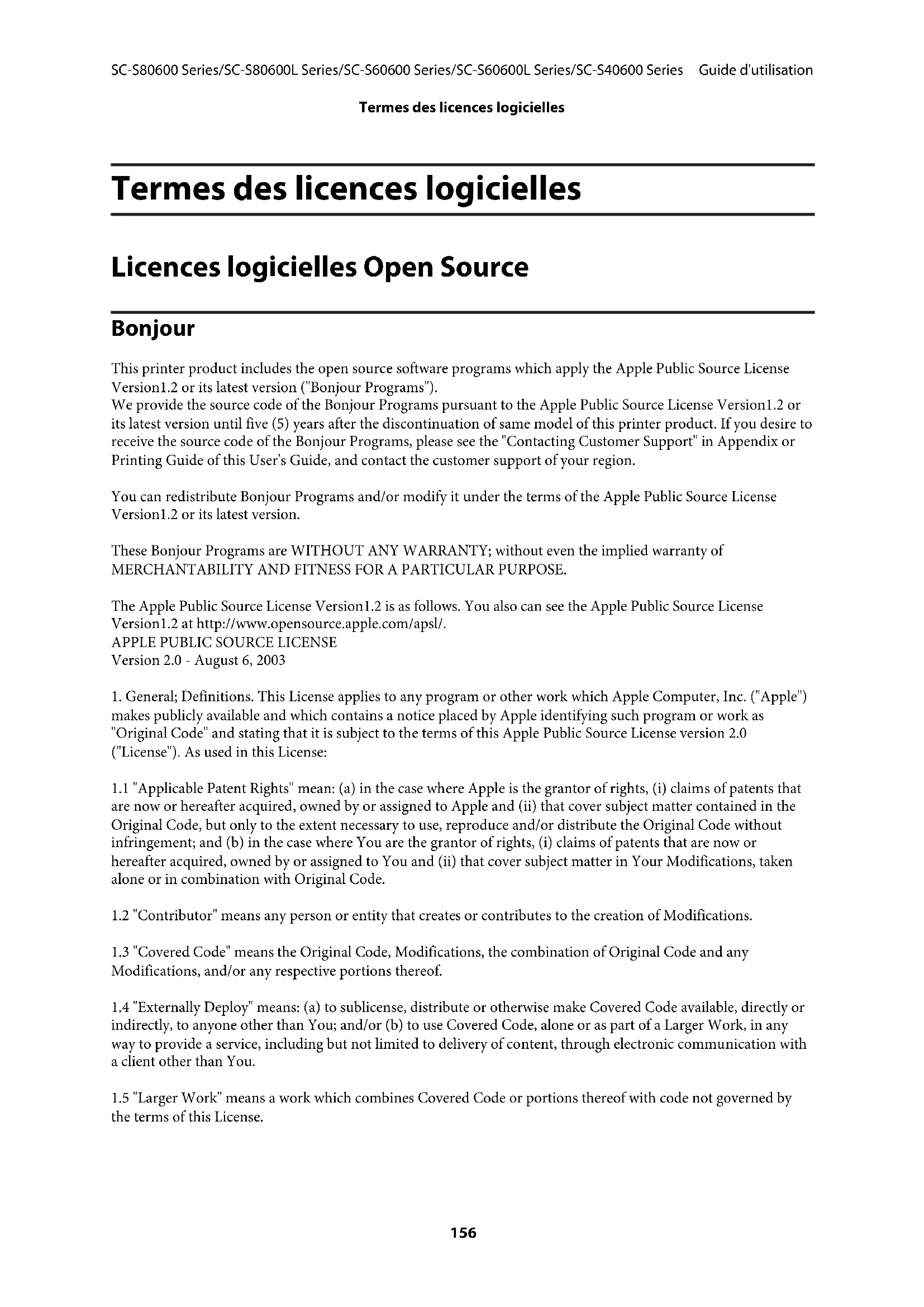 the terms of this License. SC-S80600 Series/SC-S80600L Series/SC-S60600 Series/SC-S60600L Series/SC-S40600 Series Guide d'utilisation Termes des licences logicielles 1561.6 "Modifications" mean any addition to, deletion from, and/or change to, the substance and/or structure of the Original Code, any previous Modifications, the combination of Original Code and any previous Modifications, and/ or any respective portions thereof. When code is released as a series of files, a Modification is: (a) any addition to or deletion from the contents of a file containing Covered Code; and/or (b) any new file or other representation of computer program statements that contains any part of Covered Code.