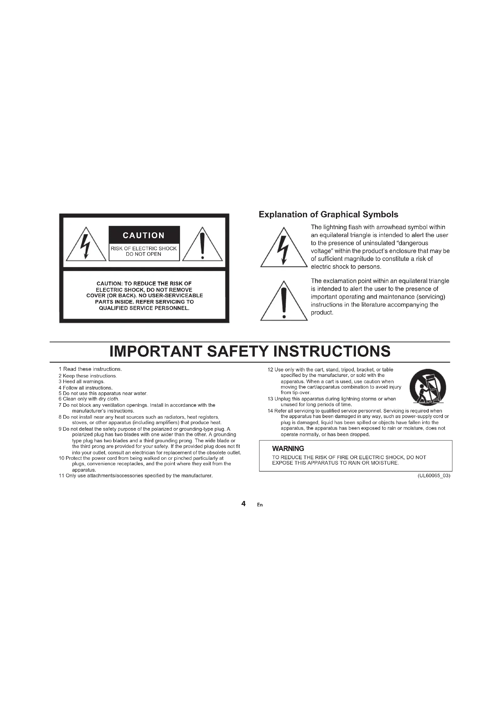 1 Read these instructions.2 Keep these instructions.3 Heed all warnings.4 Follow all instructions.5 Do not use this apparatus near water.6 Clean only with dry cloth.7 Do not block any ventilation openings. Install in accordance with the manufacturer’s instructions.8 Do not install near any heat sources such as radiators, heat registers, stoves, or other apparatus (including amplifiers) that produce heat.9 Do not defeat the safety purpose of the polarized or grounding-type plug. A polarized plug has two blades with one wider than the other. A grounding type plug has two blades and a third grounding prong. The wide blade or the third prong are provided for your safety. If the provided plug does not fit into your outlet, consult an electrician for replacement of the obsolete outlet.10 Protect the power cord from being walked on or pinched particularly at plugs, convenience receptacles, and the point where they exit from the apparatus.11 Only use attachments/accessories specified by the manufacturer.12 Use only with the cart, stand, tripod, bracket, or table specified by the manufacturer, or sold with the apparatus. When a cart is used, use caution when moving the cart/apparatus combination to avoid injury from tip-over.13 Unplug this apparatus during lightning storms or when unused for long periods of time.14 Refer all servicing to qualified service personnel. Servicing is required when the apparatus has been damaged in any way, such as power-supply cord or plug is damaged, liquid has been spilled or objects have fallen into the apparatus, the apparatus has been exposed to rain or moisture, does not operate normally, or has been dropped.(UL60065_03)CAUTION: TO REDUCE THE RISK OF ELECTRIC SHOCK, DO NOT REMOVE COVER (OR BACK). NO USER-SERVICEABLE PARTS INSIDE. REFER SERVICING TO QUALIFIED SERVICE PERSONNEL. CAUTION