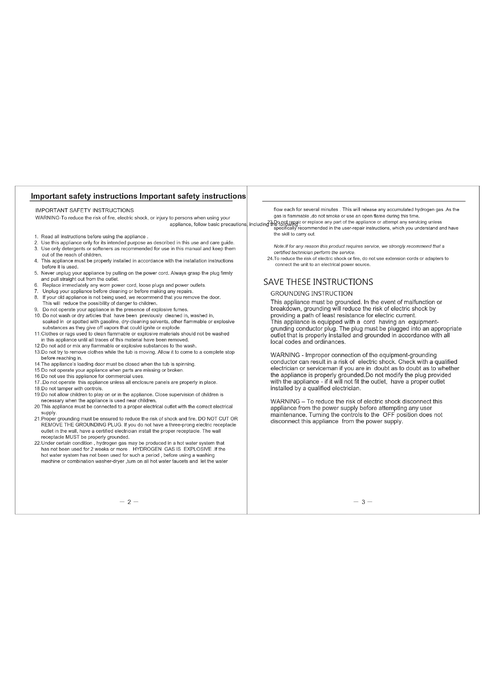 .................................................................Installing Quick Sink AdapterIMPORTANT SAFETY INSTRUCTIONS WARNING-To reduce the risk of fire, electric shock, or injury to persons when using your appliance, follow basic precautions, including the following : 1. Read all instructions before using the appliance .2. Use this appliance only for its intended purpose as described in this use and care guide.3. Use only detergents or softeners as recommended for use in this manual and keep them out of the reach of children.4. This appliance must be properly installed in accordance with the installation instructions before it is used.5. Never unplug your appliance by pulling on the power cord. Always grasp the plug firmly and pull straight out from the outlet.6. Replace immediately any worn power cord, loose plugs and power outlets.7. Unplug your appliance before cleaning or before making any repairs.8. If your old appliance is not being used, we recommend that you remove the door. This will reduce the possibility of danger to children.9. Do not operate your appliance in the presence of explosive fumes.10. Do not wash or dry articles that have been previously cleaned in, washed in, soaked in or spotted with gasoline, dry-cleaning solvents, other flammable or explosive substances as they give off vapors that could ignite or explode.11.Clothes or rags used to clean flammable or explosive materials should not be washed in this appliance until all traces of this material have been removed.12.Do not add or mix any flammable or explosive substances to the wash.13.Do not try to remove clothes while the tub is moving. Allow it to come to a complete stop before reaching in.14.The appliance’s loading door must be closed when the tub is spinning.15.Do not operate your appliance when parts are missing or broken.16.Do not use this appliance for commercial uses.17..Do not operate this appliance unless all enclosure panels are properly in place.18.Do not tamper with controls.19.Do not allow children to play on or in the appliance. Close supervision of children is necessary when the appliance is used near children.20.This appliance must be connected to a proper electrical outlet with the correct electrical supply.21.Proper grounding must be ensured to reduce the risk of shock and fire. DO NOT CUT OR REMOVE THE GROUNDING PLUG. If you do not have a three-prong electric receptacle outlet in the wall, have a certified electrician install the proper receptacle. The wall receptacle MUST be properly grounded.22.Under certain condition , hydrogen gas may be produced in a hot water system that has not been used for 2 weeks or more . HYDROGEN GAS IS EXPLOSIVE .If the hot water system has not been used for such a period , before using a washing machine or combination washer-dryer ,turn on all hot water faucets and let the water