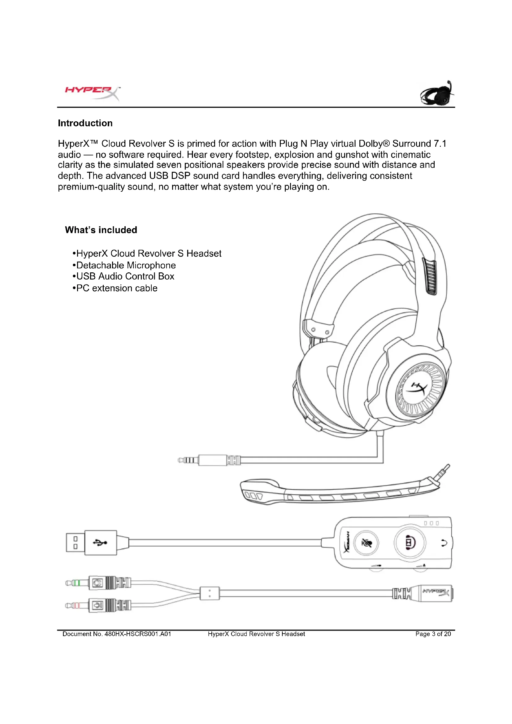 ) ...................................................................................................................... 19 Usage (Mobile Device) ........................................................................................................... 20Document No. 480HX-HSCRS001.A01 HyperX Cloud Revolver S Headset Page 3 of 20 Introduction HyperX™ Cloud Revolver S is primed for action with Plug N Play virtual Dolby® Surround 7.1 audio — no software required. Hear every footstep, explosion and gunshot with cinematic clarity as the simulated seven positional speakers provide precise sound with distance and depth. The advanced USB DSP sound card handles everything, delivering consistent premium-quality sound, no matter what system you’re playing on. What’s included
