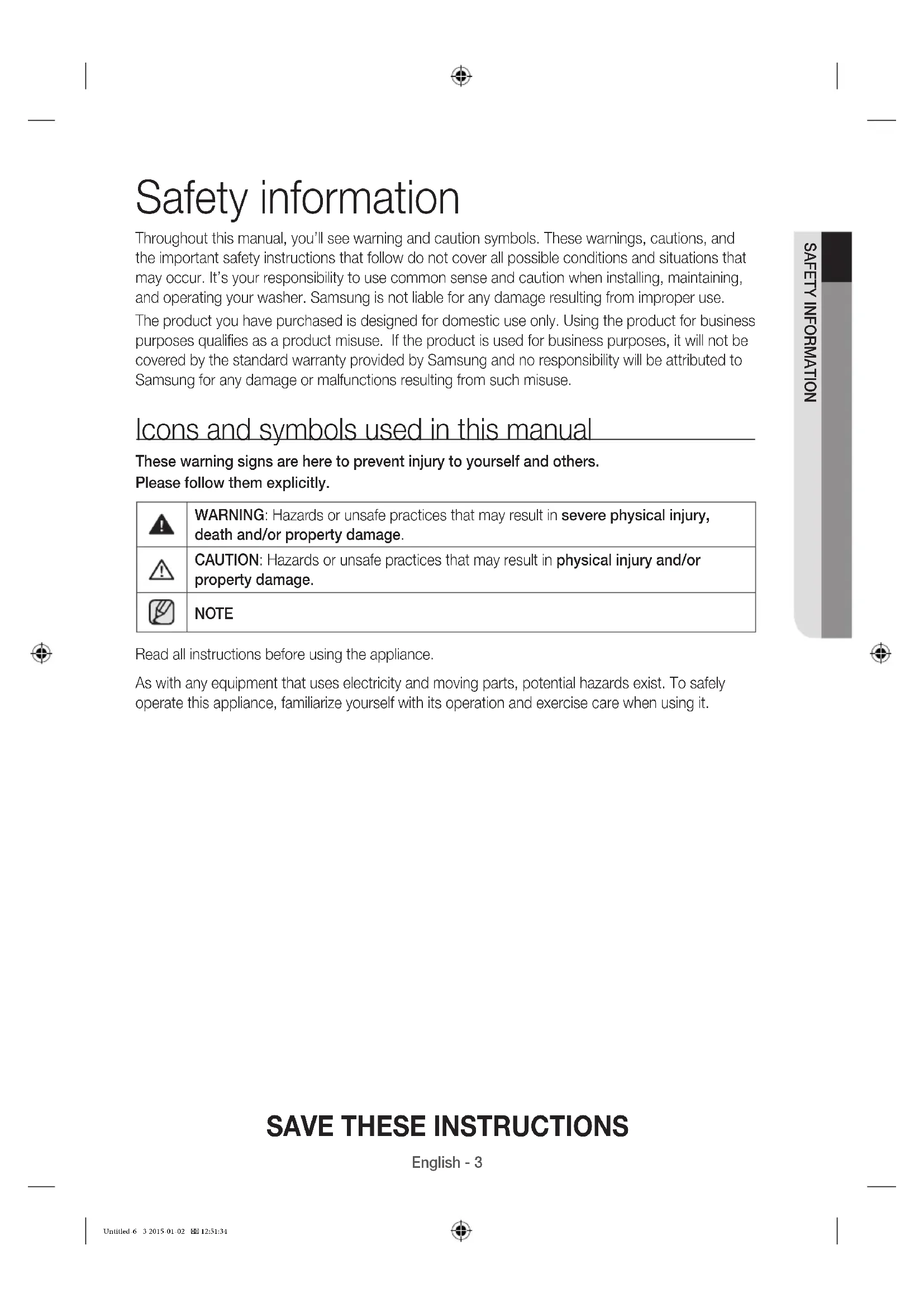 Safety information Throughout this manual, you’ll see warning and caution symbols. These warnings, cautions, and the important safety instructions that follow do not cover all possible conditions and situations that may occur. It’s your responsibility to use common sense and caution when installing, maintaining, and operating your washer. Samsung is not liable for any damage resulting from improper use. The product you have purchased is designed for domestic use only. Using the product for business purposes qualifies as a product misuse. If the product is used for business purposes, it will not be covered by the standard warranty provided by Samsung and no responsibility will be attributed to Samsung for any damage or malfunctions resulting from such misuse. Icons and symbols used in this manual These warning signs are here to prevent injury to yourself and others. Please follow them explicitly.