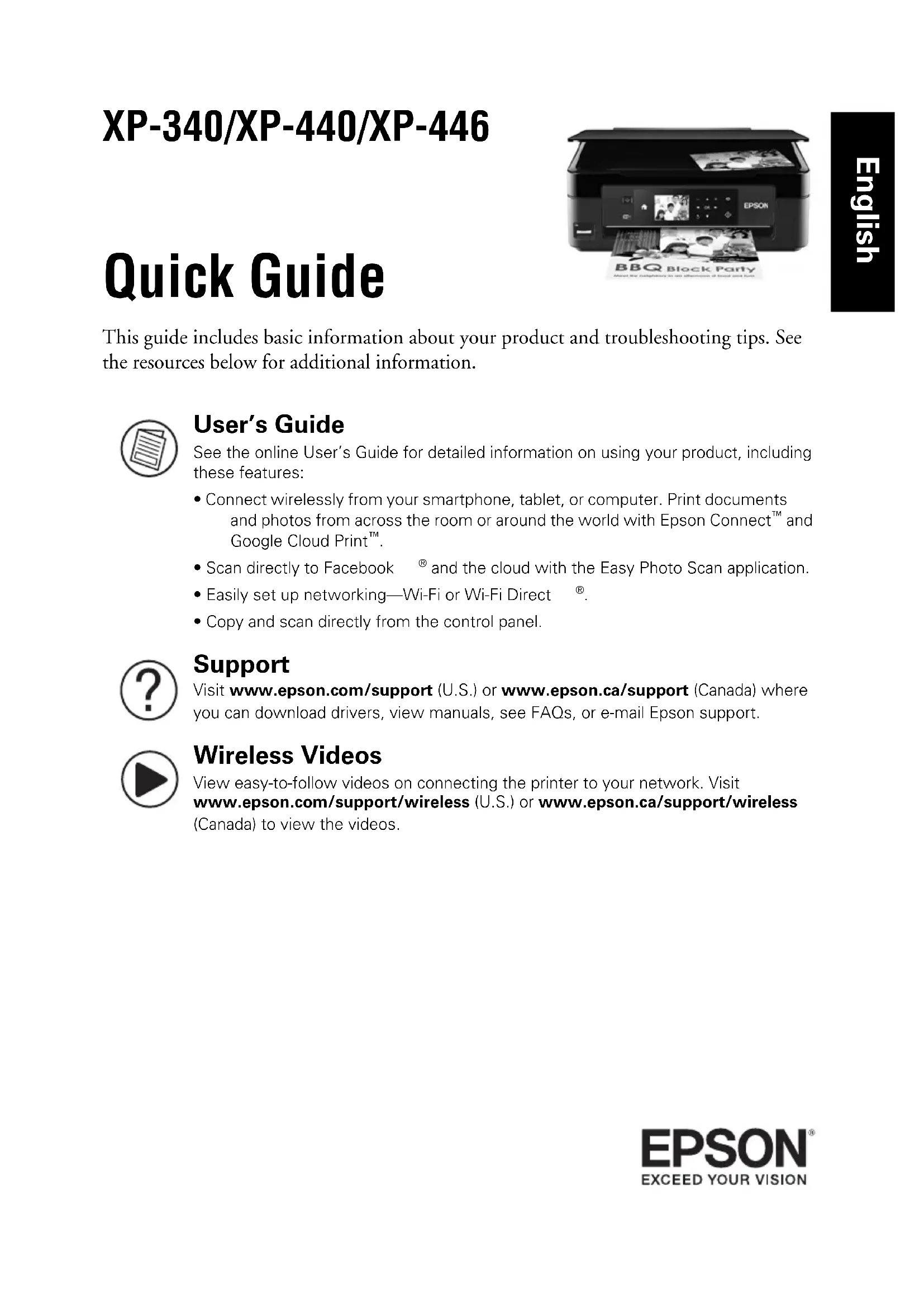 XP-340/XP-440/XP-446 Quick Guide This guide includes basic information about your product and troubleshooting tips. See the resources below for additional information. User’s Guide See the online User’s Guide for detailed information on using your product, including these features:• Connect wirelessly from your smartphone, tablet, or computer. Print documents and photos from across the room or around the world with Epson Connect and Google Cloud Print