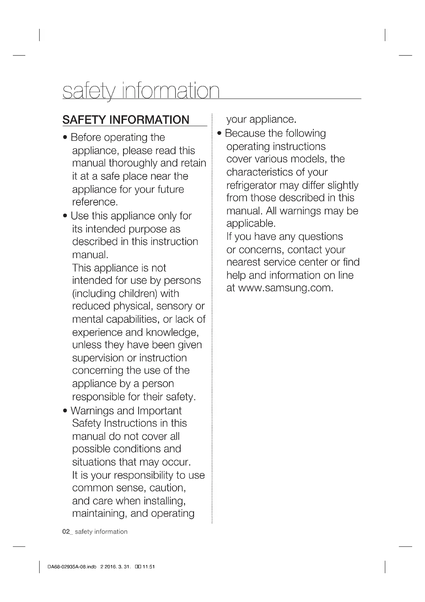 English Refrigerator user manual imagine the possibilities Thank you for purchasing a Samsung product. Built-in DA68-02935A-08.indb 1 2016. 3. 31. 11:5102_ safety information SAFETY INFORMATION
