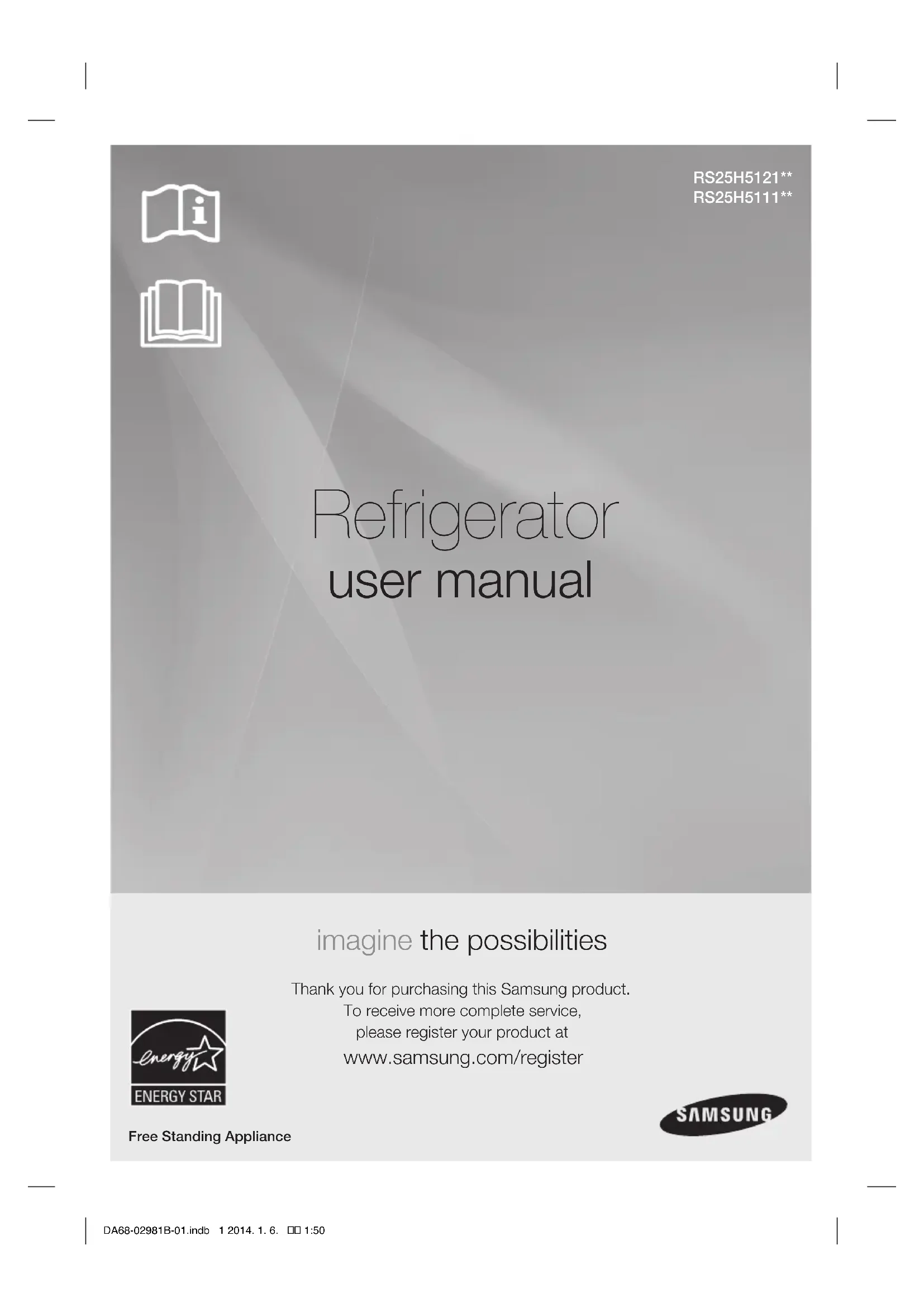Refrigerator user manual imagine the possibilities Thank you for purchasing this Samsung product. To receive more complete service, please register your product at www.samsung.com/register Free Standing Appliance RS25H5121** RS25H5111** DA68-02981B-01.indb 1 2014. 1. 6. 1:50English - 2 Safety information SAFETY INFORMATION Before using your new Samsung Side-By-Side Refrigerator, please read this manual thoroughly to ensure that you know how to operate the features and functions that your new appliance offers safely and efficiently. This appliance is not intended for use by persons (including children) with reduced physical, sensory, or mental capabilities, or those who lack experience and knowledge, unless they have been given supervision or instruction concerning the use of the appliance by a person responsible for their safety. Because the following instructions cover various models, the characteristics of your refrigerator may differ slightly from the refrigerator described in this manual. If you have any question, contact us at 1-800-SAMSUNG or find help and information online at www.samsung.com. Important safety symbols and precautions: WARNING Hazards or unsafe practices that may result in severe personal injury or death. CAUTION Hazards or unsafe practices that may result in minor personal injury or property damage. Do NOT attempt. Do NOT disassemble. Do NOT touch. Follow directions carefully. Unplug the power plug from the wall socket. Make sure the refrigerator is grounded to prevent electric shock. Call the contact center for help. Note. These warning symbols are here to prevent injury to you and others. Please follow them carefully. After reading this section, keep it in a safe place for future reference. Contents SAFETY INFORMATION ……………………………………………………………… 2