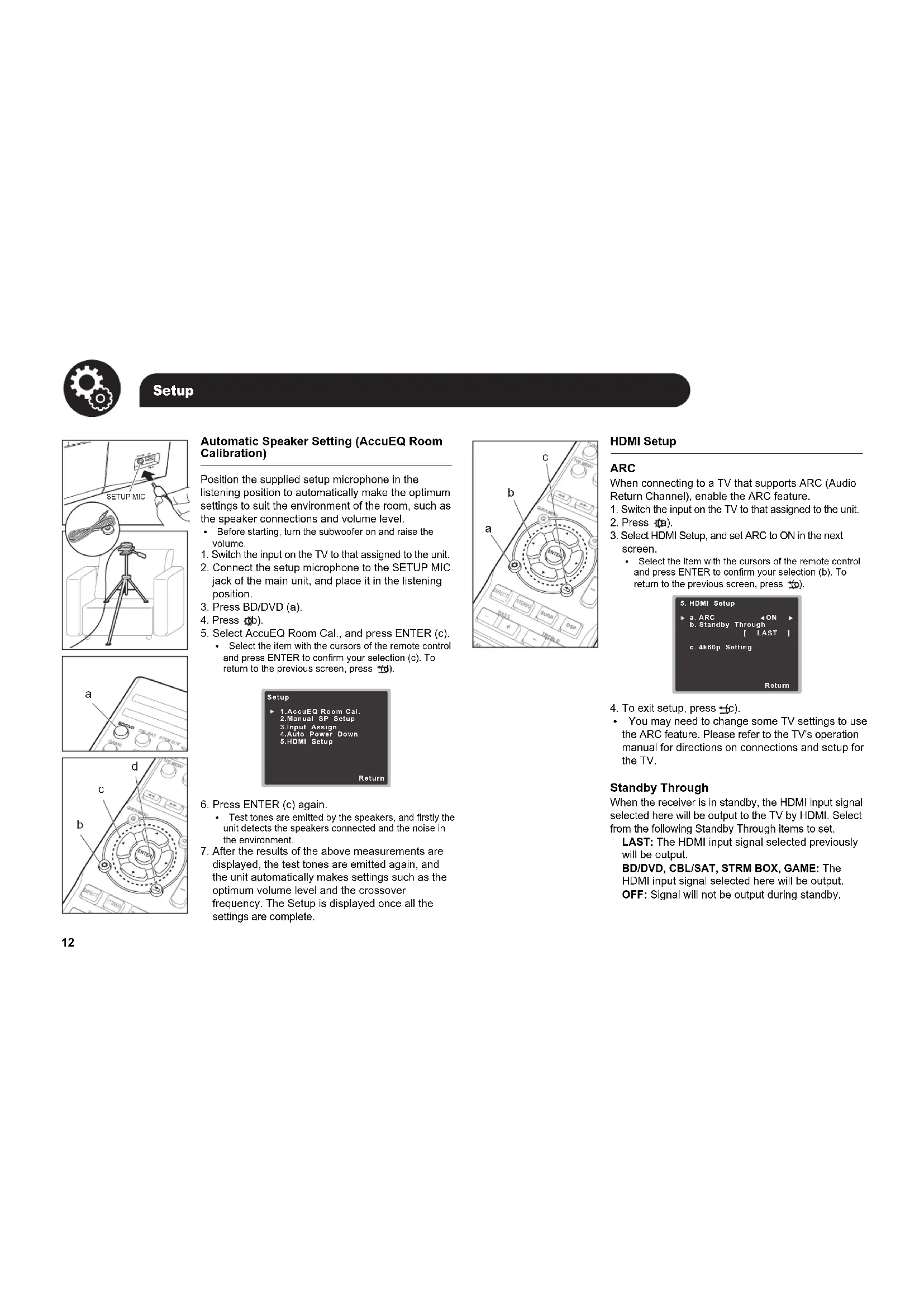 displayed, the test tones are emitted again, and the unit automatically makes settings such as the optimum volume level and the crossover frequency. The Setup is displayed once all the settings are complete. Setup1.AccuEQ Room Cal.2.Manual SP Setup3.Input Assign4.Auto Power Down5.HDMI SetupReturn