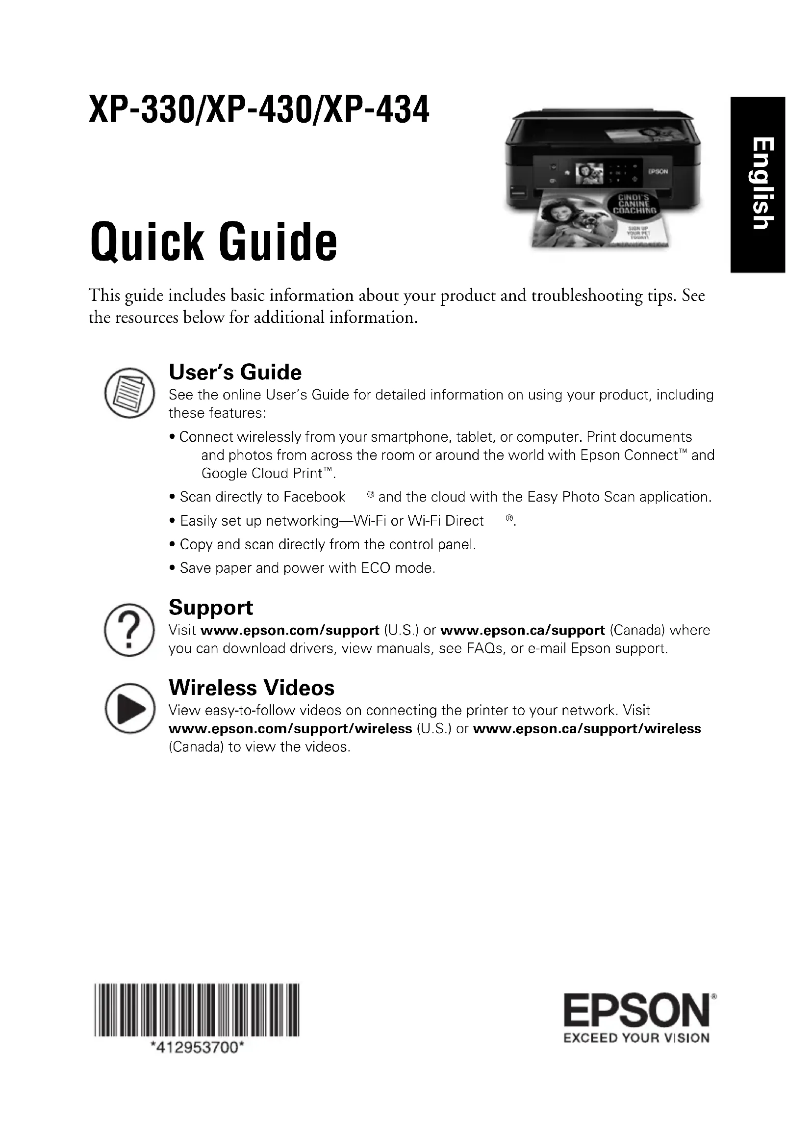 XP-330/XP-430/XP-434 Quick Guide This guide includes basic information about your product and troubleshooting tips. See the resources below for additional information. User’s Guide See the online User’s Guide for detailed information on using your product, including these features:• Connect wirelessly from your smartphone, tablet, or computer. Print documents and photos from across the room or around the world with Epson Connect and Google Cloud Print