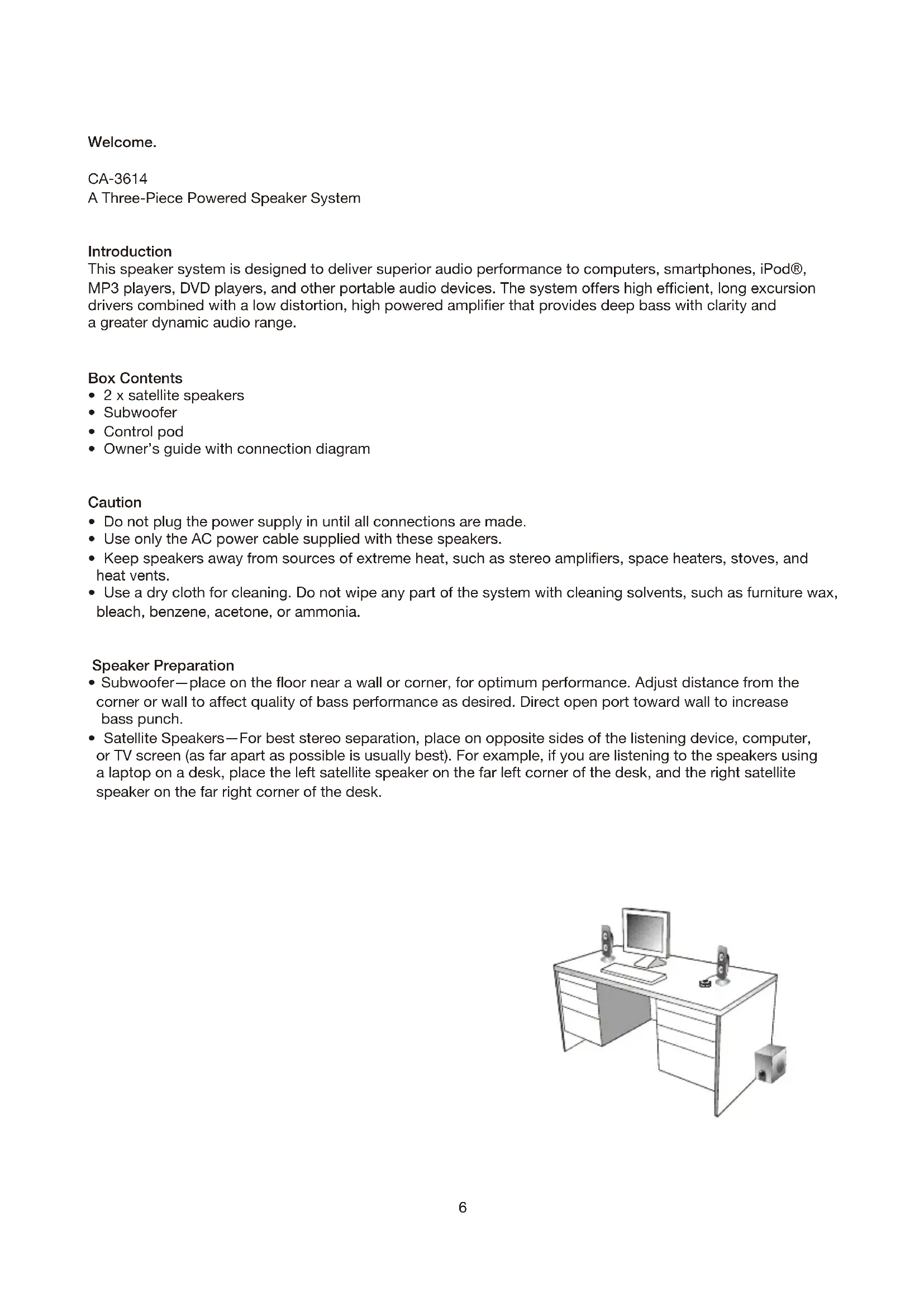 Download the instructions for your Speaker in PDF format for free! Find your manual CA3614 - Cyber Acoustics and take your electronic device back in hand. On this page are published all the documents necessary for the use of your device. CA3614 by Cyber Acoustics.