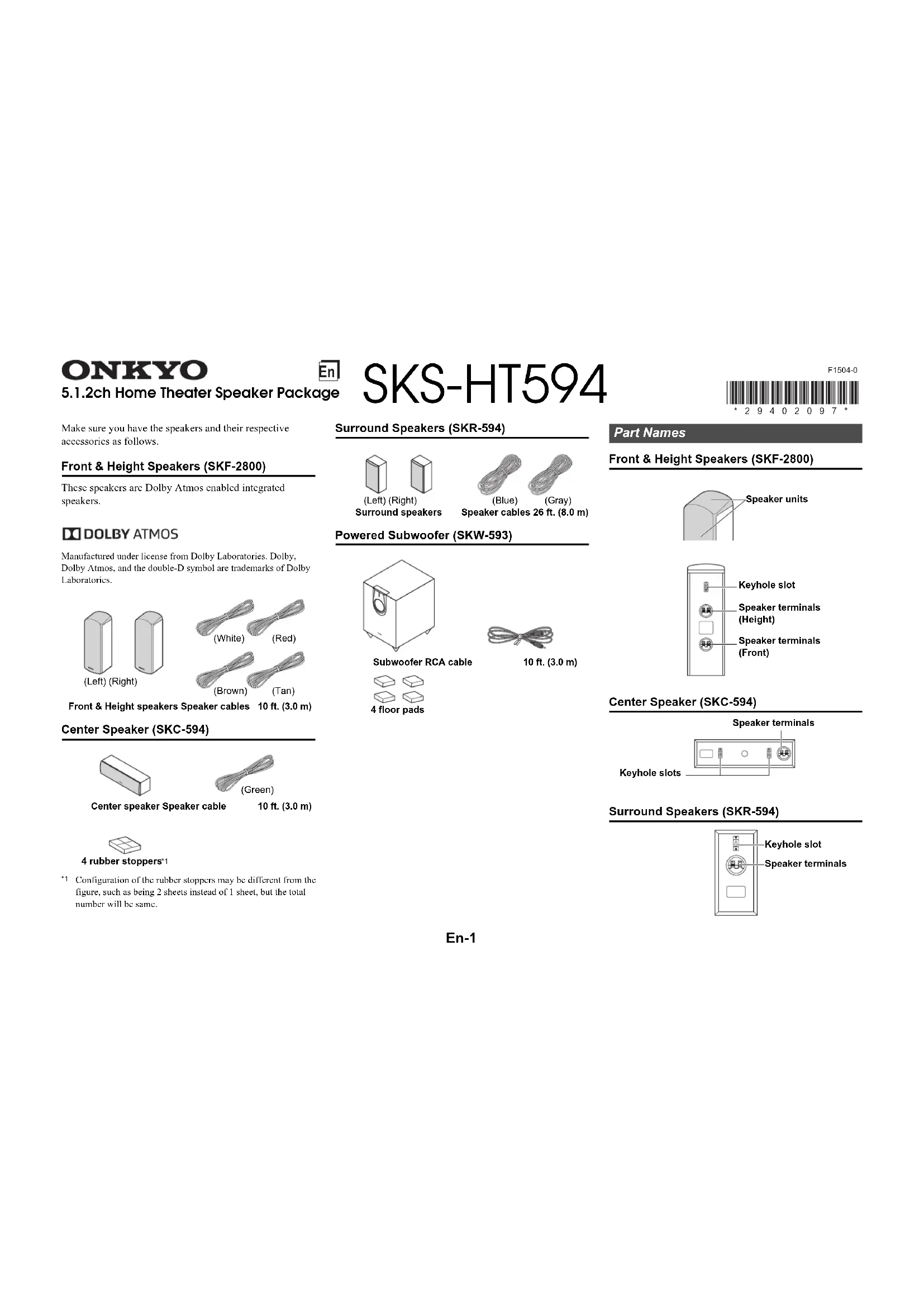 Configuration of the rubber stoppers may be different from the figure, such as being 2 sheets instead of 1 sheet, but the total number will be same. Surround Speakers (SKR-594) Powered Subwoofer (SKW-593) Front & Height Speakers (SKF-2800) Center Speaker (SKC-594) Surround Speakers (SKR-594) Front & Height speakers Speaker cables 10 ft. (3.0 m) Center speaker Speaker cable 10 ft. (3.0 m)4 rubber stoppers