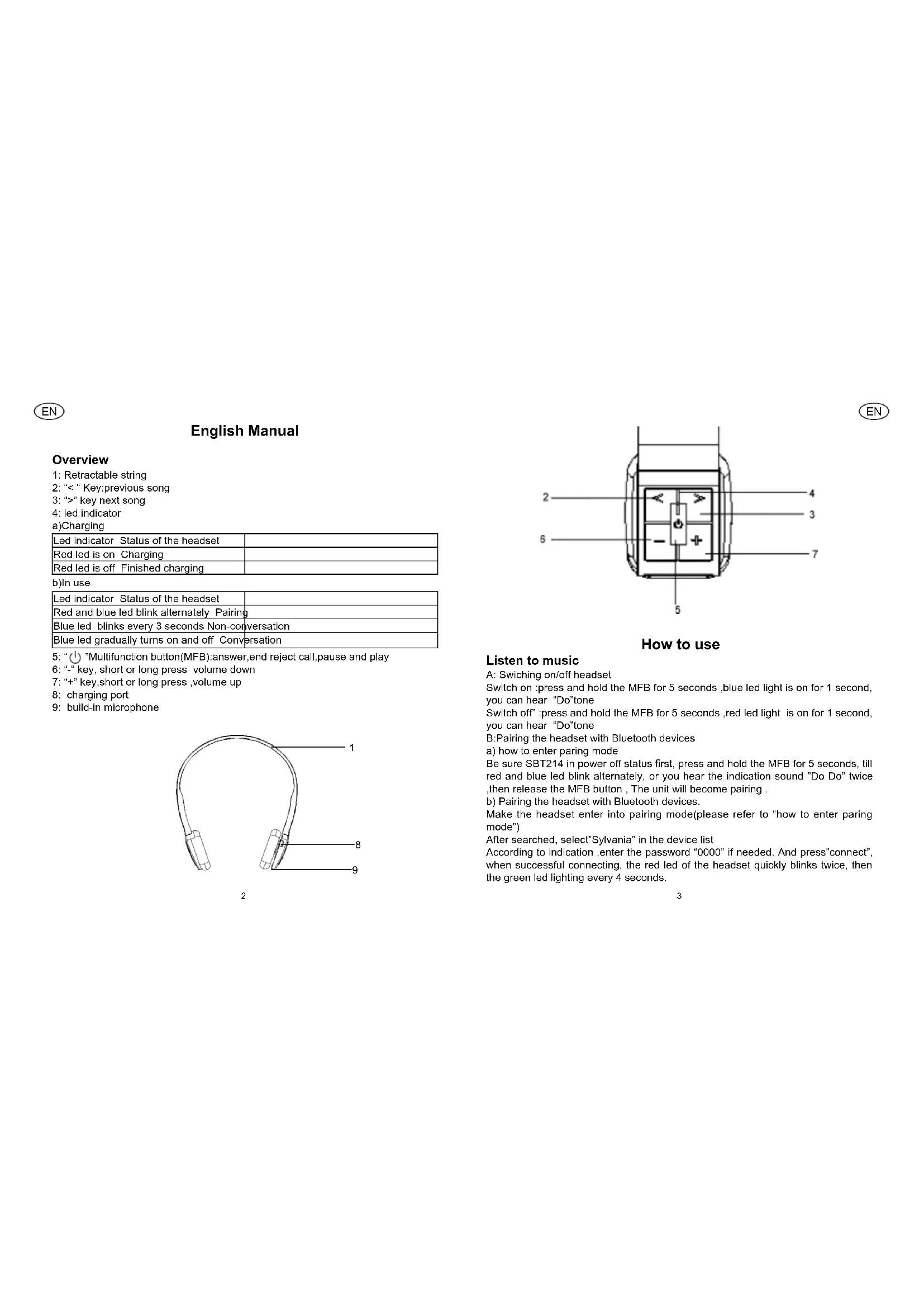 How to use Listen to music A: Swiching on/off headset Switch on :press and hold the MFB for 5 seconds ,blue led light is on for 1 second, you can hear “Do”tone Switch off” :press and hold the MFB for 5 seconds ,red led light is on for 1 second, you can hear “Do”tone B:Pairing the headset with Bluetooth devices a) how to enter paring mode Be sure SBT214 in power off status rst, press and hold the MFB for 5 seconds, till red and blue led blink alternately, or you hear the indication sound ”Do Do” twice ,then release the MFB button , The unit will become pairing . b) Pairing the headset with Bluetooth devices. Make the headset enter into pairing mode(please refer to “how to enter paring mode”) After searched, select”Sylvania” in the device list According to indication ,enter the password “0000” if needed. And press”connect”, when successful connecting, the red led of the headset quickly blinks twice, then the green led lighting every 4 seconds. 9ENEN