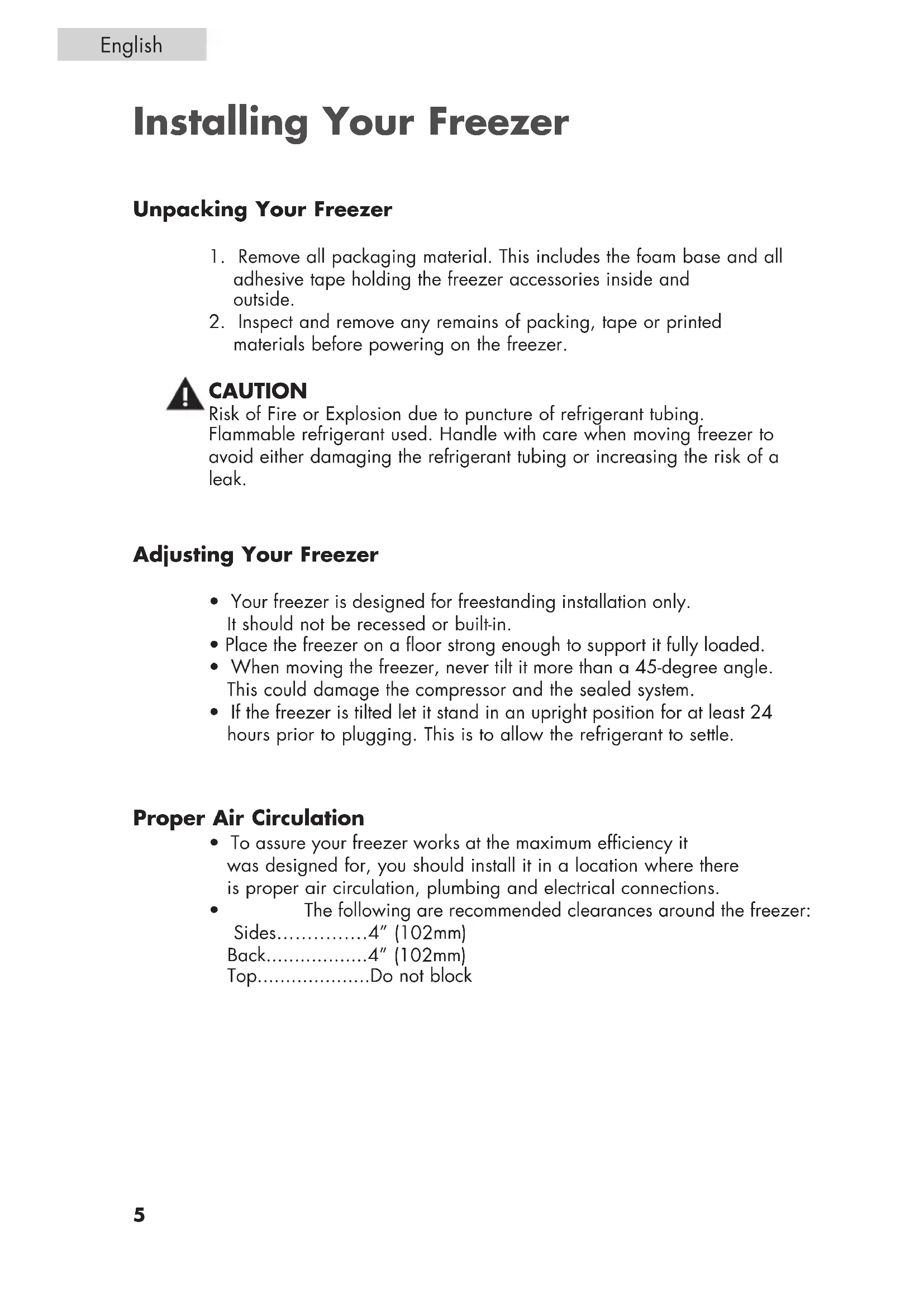 - The following are recommended clearances around the freezer: Sides……………4” (102mm) Back..................4” (102mm) Top....................Do not block Unpacking Your Freezer Adjusting Your Freezer Proper Air Circulation Installing Your FreezerEnglish Electrical Requirement