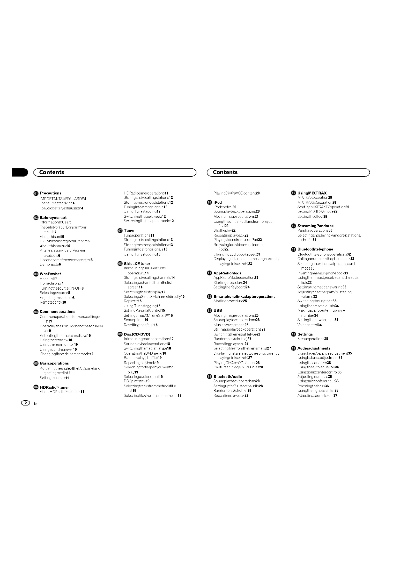 <CRD4758-A>29Black plate (30,1) ! Turntable – A fixed sound that mimics DJ scratching. ! Flanger2 – A rushing sound that mimics that rising and falling sounds of a jet engine. ! Reverb – A fixed sound effect that creates a reverberation effect. ! Echo2 – A fixed sound effect that creates an echoing effect. Sound effects ! Cross Fade – A sound effect that creates a fade in and fade out effect between songs. ! Flanger1 – A rushing sound that mimics that rising and falling sounds of a jet engine. ! Echo1 – A sound effect that creates an echo- ing effect. ! Loop – A sound effect that repeats playback of one section of a song track. Note Cross Fade cannot be selected for iPod audio files. Setting sounds and sound effects as presets using the preset key The Standard and Simple sound effects are set already as default presets. % Touch Standard or Simple to check the settings. The registered preset sound effect for the key that was touched is set as a preset. Registering sounds and sound effects as presets Registers a desired combination of sounds and sound effects to Custom. Touch Custom to easily set the desired sound or sound effect. 1 Touch Custom. 2 Add a check mark to the desired sound effect by touching the option. The marked sound effect is registered as a pre- set in Custom. Notes ! If a sound effect is touched in the selection screen for Standard or Simple, the Custom screen is automatically displayed and the sound effect is registered to Custom. ! You can listen to fixed sounds to hear exam- ples by touching the speaker icon. Pandora operations For iPhone users — Connect an iPod to USB input. — Set Pandora Connection to iPhone. (Function of AVH-X5600BHS/AVH-X4600BT/ AVH-X3600BHS/AVH-X2600BT) (This setting is not required for AVH- X1600DVD.) For smartphone users (Function of AVH-X5600BHS/AVH-X4600BT/AVH- X3600BHS/AVH-X2600BT) — Set Pandora Connection to Android. — A Bluetooth connection is required for Android devices. Refer to Bluetooth connec- tion menu on page 45. Important Requirements to access Pandora using the Pioneer car audio/video products: Connect an iPod to USB input or an Android de- vice using Bluetooth to play Pandora on this unit. ! Please update the firmware of the Pandora appli-cation to the latest version before use.! The latest version of the Pandora application canbe downloaded on iTunes App Store and GooglePlay.! Create a free or a paid account online. You cancreate the account in the Pandora applicationfrom your iPhone or on the website. The URL inthe following:http://www.pandora.com/register! If the Data Plan for your iPhone does not providefor unlimited data usage, additional chargesfrom your carrier may apply for accessing thePandora service via 3G and/or EDGE networks.! You need to connect to the Internet via 3G, EDGEor Wi-Fi network to use the service from Pandora. Limitations: ! Depending on the availability to the Internet, youmay not be able to receive Pandora service.! Pandora service is subject to change without no-tice. The service could be affected by any of thefollowing: firmware versions of iPhone, firmwareversions of Pandora application, changes to thePandora music service.! Certain functions of the Pandora service are notavailable when accessing the service through thePioneer car audio/video products. They include,but not limited to the following: creating new sta-tions, deleting stations, sending informationabout current stations, buying tracks fromiTunes, viewing additional text information, log-ging in to Pandora, adjusting Cell Network AudioQuality. Pandora internet radio is a music service not af- filiated with Pioneer. More information is avail- able at http://www.pandora.com. The Pandora mobile application is available for most iPhone and smartphone, please visit www.pandora.com/everywhere/mobile for the latest compatibility information. Setting the Pandora connect mode (Function of AVH-X5600BHS/AVH-X4600BT/AVH- X3600BHS/AVH-X2600BT) Note This function is not available when Device connection is set to iPhone via Bluetooth. 1 Press the home button to switch to the home display. 2 Touch the system key to open the system menu. 3 Touch Pandora Connection repeatedly until the desired setting appears on the screen. iPhone: An iPhone is connected using an actual cable. Using MIXTRAX