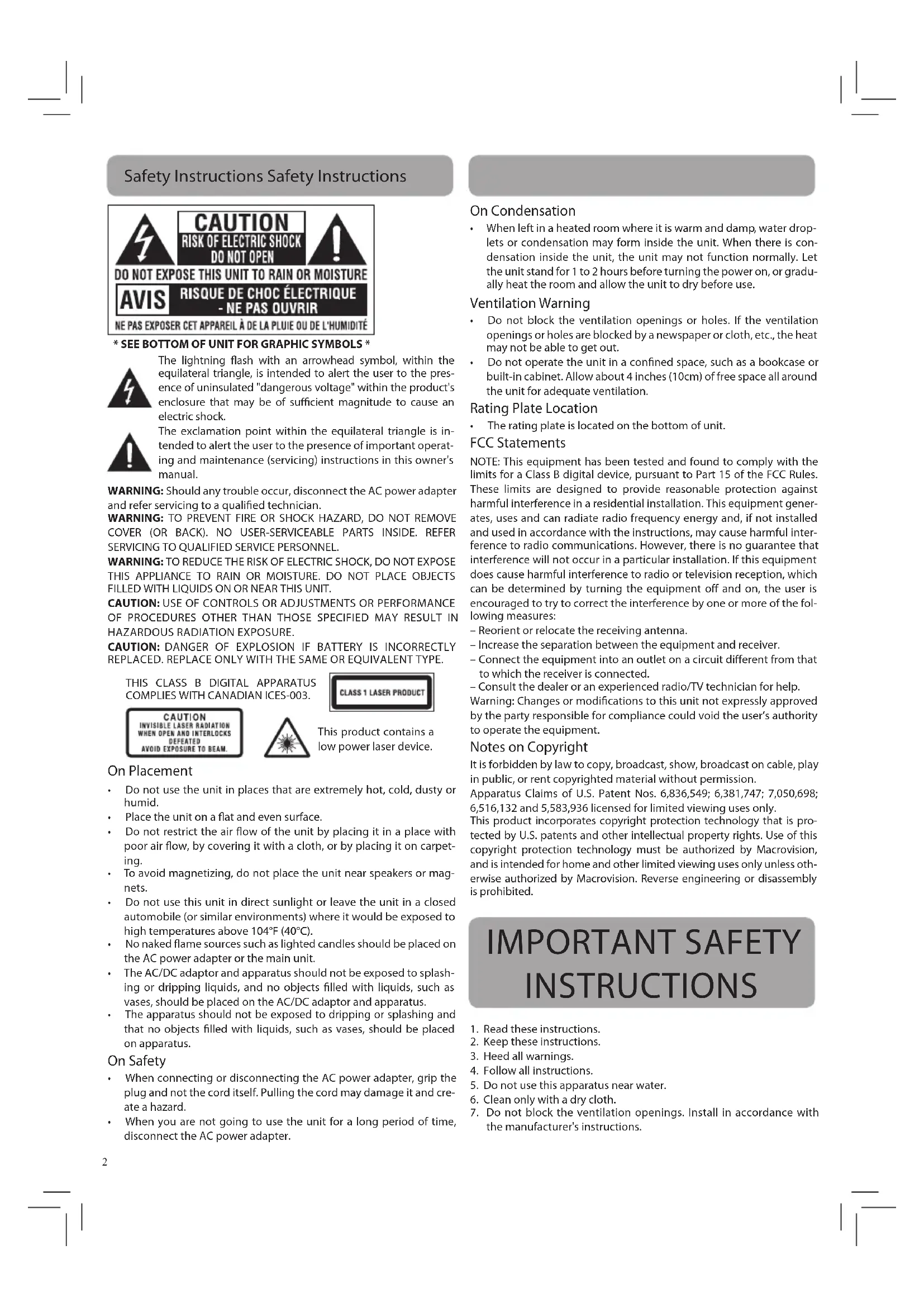 - SEE BOTTOM OF UNIT FOR GRAPHIC SYMBOLS * The lightning ash with an arrowhead symbol, within the equilateral triangle, is intended to alert the user to the pres- ence of uninsulated "dangerous voltage" within the product's enclosure that may be of sucient magnitude to cause an electric shock. The exclamation point within the equilateral triangle is in- tended to alert the user to the presence of important operat- ing and maintenance (servicing) instructions in this owner's manual. Safety Instructions Safety Instructions