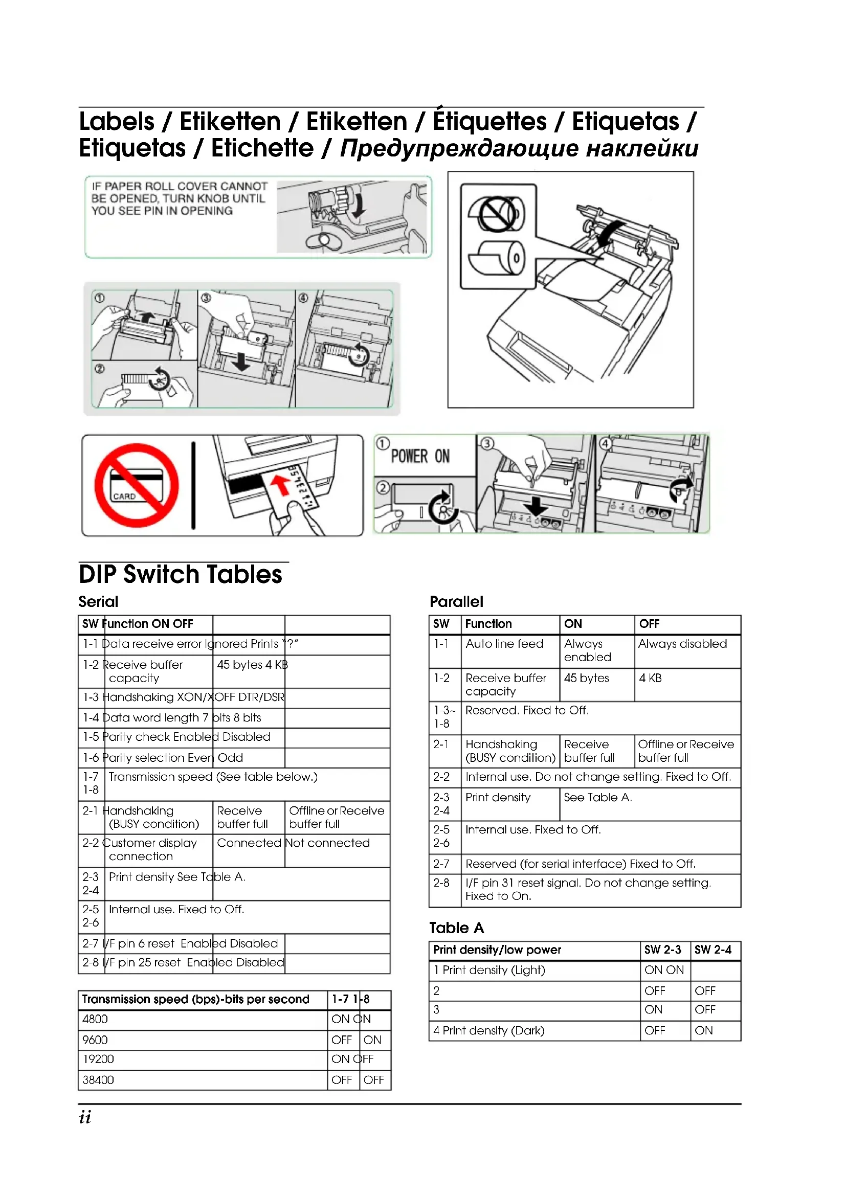 - Руководство по эксплуатации 410243300ii English Labels / Etiketten / Etiketten / Étiquettes / Etiquetas / Etiquetas / Etichette / Предупреждающие наклейки DIP Switch Tables Serial SW Function ON OFF 1-1 Data receive error Ignored Prints “?” 1-2 Receive buffer capacity 45 bytes 4 KB 1-3 Handshaking XON/XOFF DTR/DSR 1-4 Data word length 7 bits 8 bits 1-5 Parity check Enabled Disabled 1-6 Parity selection Even Odd 1-7 1-8 Transmission speed (See table below.) 2-1 Handshaking (BUSY condition) Receive buffer full Offline or Receive buffer full 2-2 Customer display connection Connected Not connected 2-3 2-4 Print density See Table A. 2-5 2-6 Internal use. Fixed to Off. 2-7 I/F pin 6 reset Enabled Disabled 2-8 I/F pin 25 reset Enabled Disabled Transmission speed (bps)-bits per second 1-7 1-8 4800 ON ON 9600 OFF ON 19200 ON OFF 38400 OFF OFF Parallel SW Function ON OFF 1-1 Auto line feed Always enabled Always disabled 1-2 Receive buffer capacity 45 bytes 4 KB 1-3~ 1-8 Reserved. Fixed to Off. 2-1 Handshaking (BUSY condition) Receive buffer full Offline or Receive buffer full 2-2 Internal use. Do not change setting. Fixed to Off. 2-3 2-4 Print density See Table A. 2-5 2-6 Internal use. Fixed to Off. 2-7 Reserved (for serial interface) Fixed to Off. 2-8 I/F pin 31 reset signal. Do not change setting. Fixed to On. Table A Print density/low power SW 2-3 SW 2-4 1 Print density (Light) ON ON 2OFFOFF 3ONOFF 4 Print density (Dark) OFF ONTM-H6000III User’s Manual 1 English English TM-H6000III User’s Manual All rights reserved. No part of this publication may be reproduced, stored in a retrieval system, or transmitted in any form or by any means, electronic, mechanical, photocopying, recording, or otherwise, without the prior written permission of Seiko Epson Corporation. No patent liability is assumed with respect to the use of the information contained herein. While every precaution has been taken in the preparation of this book, Seiko Epson Corporation assumes no responsibility for errors or omissions. Neither is any liability assumed for damages resulting from the use of the information contained herein. Neither Seiko Epson Corporation nor its affiliates shall be liable to the purchaser of this product or third parties for damages, losses, costs, or expenses incurred by purchaser or third parties as a result of: accident, misuse, or abuse of this product or unauthorized modifications, repairs, or alterations to this product, or (excluding the U.S.) failure to strictly comply with Seiko Epson Corporation’s operating and maintenance instructions. Seiko Epson Corporation shall not be liable against any damages or problems arising from the use of any options or any consumable products other than those designated as Original Epson Products or Epson Approved Products by Seiko Epson Corporation.Epson and ESC/POS are registered trademarks of Seiko Epson Corporation.NOTICE: The contents of this manual are subject to change without notice.Copyright © 2005 by Seiko Epson Corporation, Nagano, Japan.2 TM-H6000III User’s Manual English EMC and Safety Standards Applied Product Name: TM-H6000III Model Name: M147G The following standards are applied only to the printers that are so labeled. (EMC is tested using the Epson power supply.) Europe: CE markingSafety: EN 60950North America: EMI: FCC/ICES-003 Class ASafety: UL 1950/CSA C22.2 No. 950Japan: EMI: VCCI Class AOceania: EMC: AS/NZS CISPR22 Class B WARNING The connection of a non-shielded printer interface cable to this printer will invalidate the EMC standards of this device. You are cautioned that changes or modifications not expressly approved by Seiko Epson Corporation could void your authority to operate the equipment. CE Marking The printer conforms to the following Directives and Norms: Directive 89/336/EEC EN 55022 Class BEN 55024IEC 61000-4-2 IEC 61000-4-3 IEC 61000-4-4 IEC 61000-4-5 IEC 61000-4-6 IEC 61000-4-8IEC 61000-4-11 FCC Compliance Statement For American Users This equipment has been tested and found to comply with the limits for a Class A digital device, pursuant to Part 15 of the FCC Rules. These limits are designed to provide reasonable protection against harmful interference when the equipment is operated in a commercial environment. This equipment generates, uses, and can radiate radio frequency energy and, if not installed and used in accordance with the instruction manual, may cause harmful interference to radio communications. Operation of this equipment in a residential area is likely to cause harmful interference, in which case the user will be required to correct the interference at his own expense. p. 61