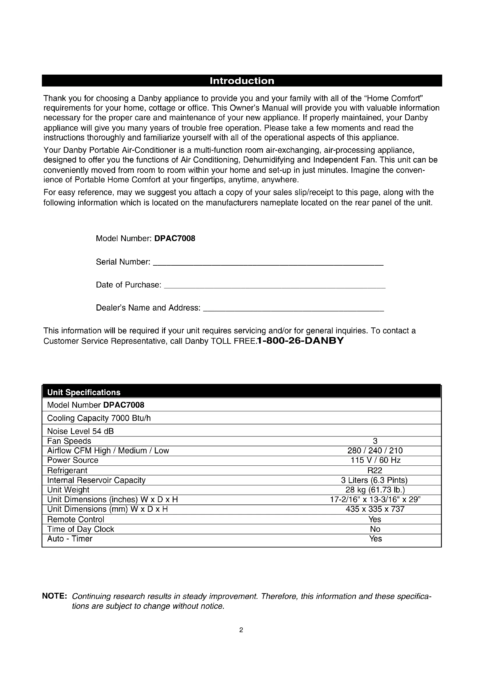 Power Cord Storage Removable Water Tank Air Filter CoverIntroduction Thank you for choosing a Danby appliance to provide you and your family with all of the “Home Comfort” requirements for your home, cottage or office. This Owner’s Manual will provide you with valuable information necessary for the proper care and maintenance of your new appliance. If properly maintained, your Danby appliance will give you many years of trouble free operation. Please take a few moments and read the instructions thoroughly and familiarize yourself with all of the operational aspects of this appliance. Your Danby Portable Air-Conditioner is a multi-function room air-exchanging, air-processing appliance, designed to offer you the functions of Air Conditioning, Dehumidifying and Independent Fan. This unit can be conveniently moved from room to room within your home and set-up in just minutes. Imagine the conven- ience of Portable Home Comfort at your fingertips, anytime, anywhere. For easy reference, may we suggest you attach a copy of your sales slip/receipt to this page, along with the following information which is located on the manufacturers nameplate located on the rear panel of the unit. Model Number: DPAC7008 Serial Number: ___________________________________________________ Date of Purchase: _________________________________________________ Dealer’s Name and Address: ________________________________________ This information will be required if your unit requires servicing and/or for general inquiries. To contact a Customer Service Representative, call Danby TOLL FREE.