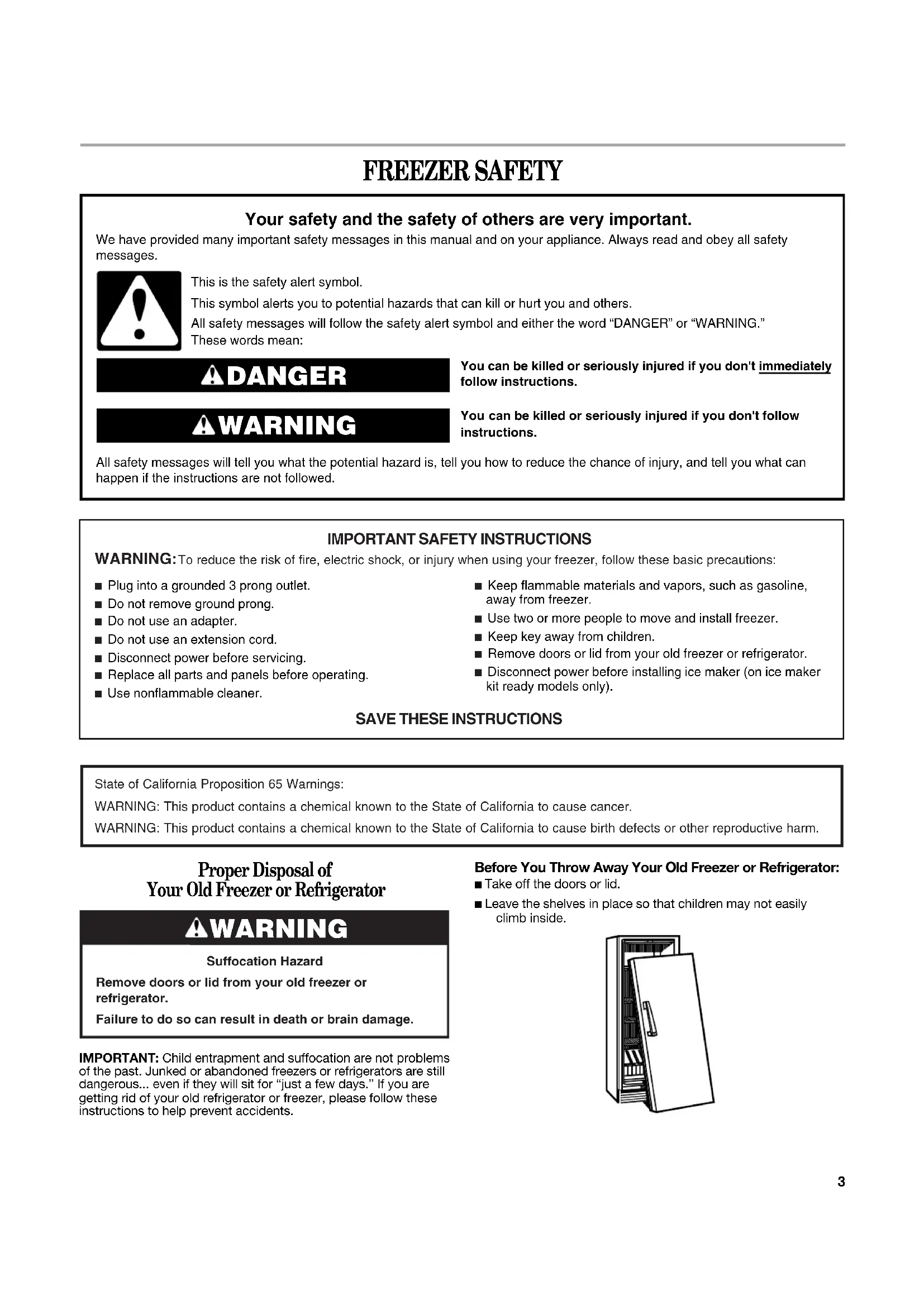 Accessoires............................................................................................. 26 GARANTIE.................................................................................................. 273 FREEZER SAFETY Proper Disposal of Your Old Freezer or Refrigerator IMPORTANT: Child entrapment and suffocation are not problems of the past. Junked or abandoned freezers or refrigerators are still dangerous... even if they will sit for “just a few days.” If you are getting rid of your old refrigerator or freezer, please follow these instructions to help prevent accidents.Before You Throw Away Your Old Freezer or Refrigerator:■ Take off the doors or lid.■ Leave the shelves in place so that children may not easily climb inside.You can be killed or seriously injured if you don't immediately You can be killed or seriously injured if you don'tfollow All safety messages will tell you what the potential hazard is, tell you how to reduce the chance of injury, and tell you what can happen if the instructions are not followed. Your safety and the safety of others are very important. We have provided many important safety messages in this manual and on your appliance. Always read and obey all safety messages.This is the safety alert symbol.This symbol alerts you to potential hazards that can kill or hurt you and others.All safety messages will follow the safety alert symbol and either the word “DANGER” or “WARNING.”These words mean:follow instructions.instructions. DANGER WARNING
