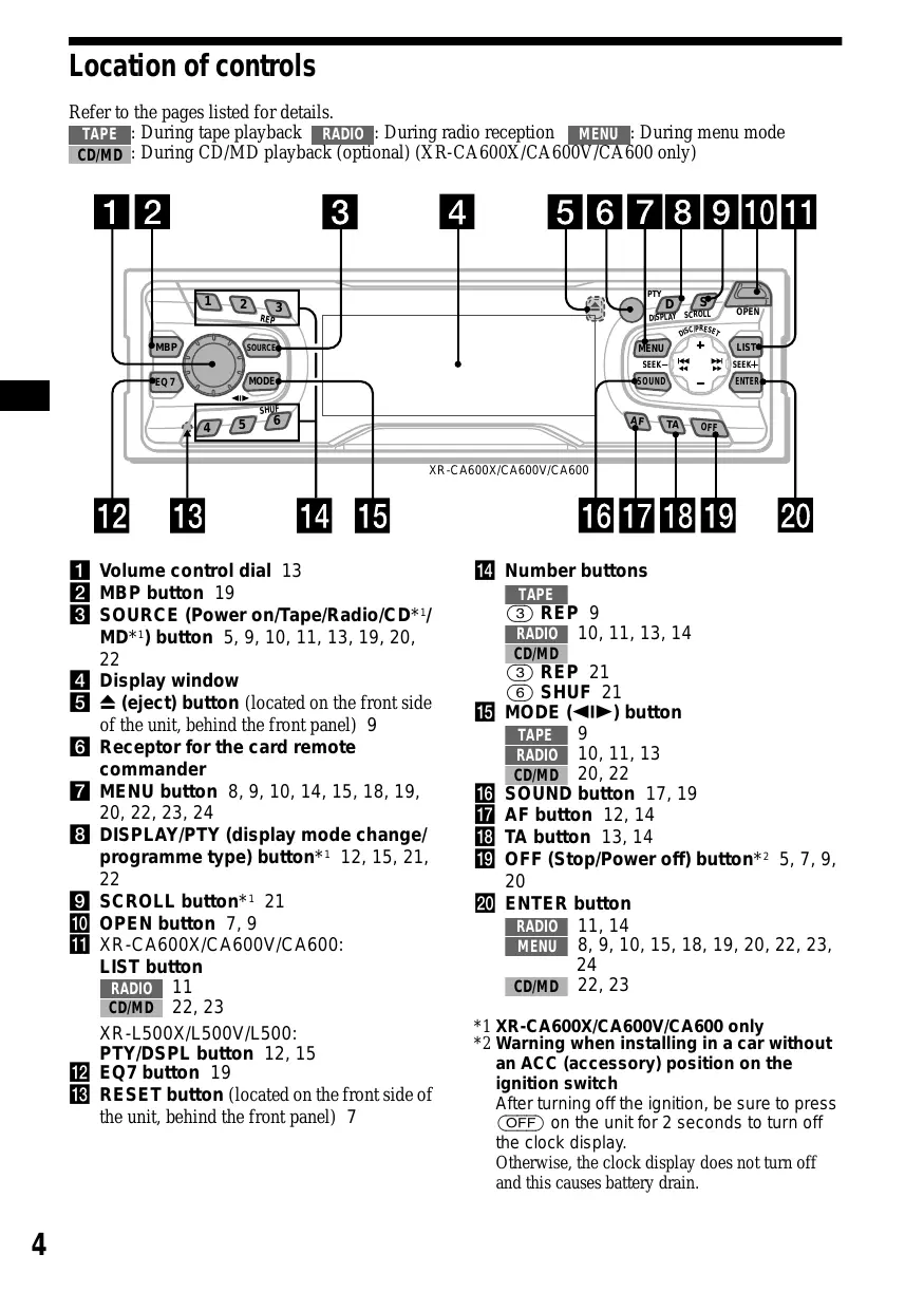 3 SOURCE (Power on/Tape/Radio/CD*1/ MD*1) button 5,9,10,11,13,19,20, 22