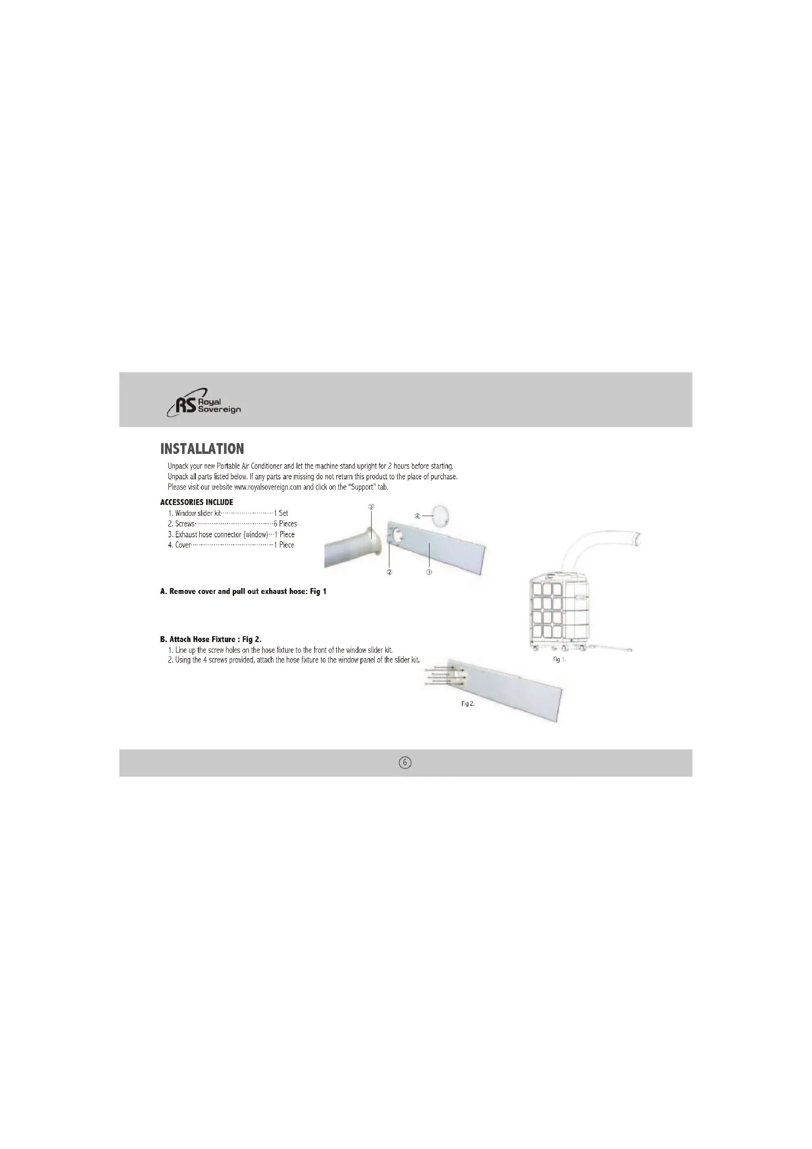 INSTALLATION Unpack your new Portable Air Conditioner and let the machine stand upright for 2 hours before starting. Unpack all parts listed below. If any parts are missing do not return this product to the place of purchase. Please visit our website www.royalsovereign.com and click on the “Support” tab. ACCESSORIES INCLUDE