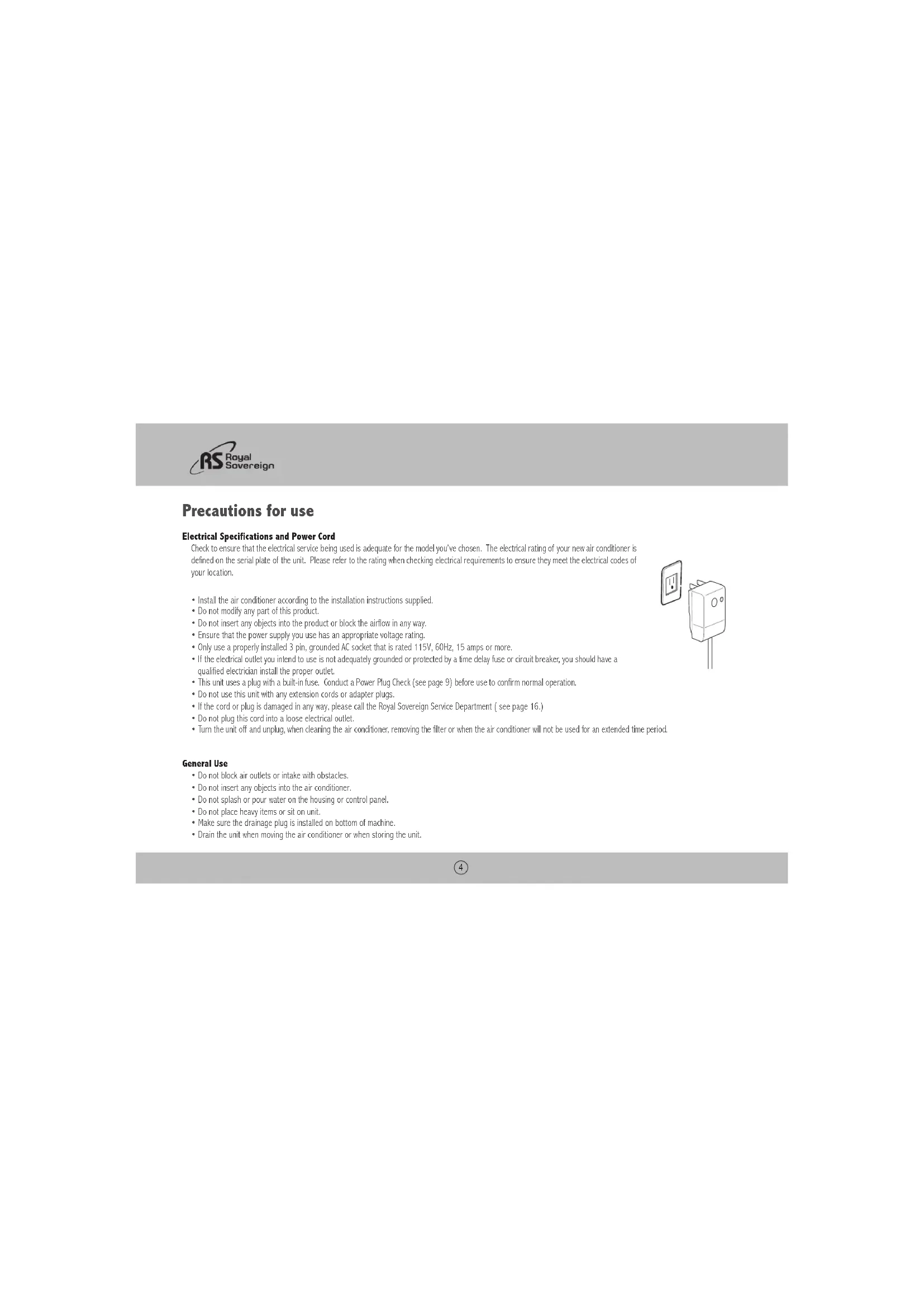 Royal Sovereign warrants each Portable Air Conditioner to be free from defects in material and workmanship. Our obligation under this warranty is limited to the repair or replacement, free of charge, when delivered to an authorized Royal Sovereign service center, of any defective part(s) thereof, other than parts damaged in transit. This warranty is in effect to the original purchaser, for a period of one year from the date of purchase and is not transferable. This warranty shall apply only if the air conditioner is used on Alternating Current (AC) circuit, in accordance with the factory provided instructions which accompany it. To request servies, please go to www.royalsovereign.com - Customer Support to submit a request or call 1-800-397-1025 LIMITED FIVE YEAR WARRANTY (COMPRESSOR) For a period of five years from the date of purchase, when this Royal Sovereign Portable Air Conditioner is operated and maintained according to the instruction manual provided with the product, Royal Sovereign will supply a replacement compressor (parts only), free of charge, if the original compressor is determined to be defective in workmanship or material. If repair becomes necessary, please contact our customer service center. You will be responsible for all freight, insurance, and any other transportation charges to get the unit to our factory or service center. If shipping is required, be sure to pack the unit properly to avoid shipping damages, as we will not be responsible for such damages. EXCLUSIONS This warranty excludes and does not cover defects, malfunctions or failures of your Royal Sovereign Portable Air Conditioner, caused by repairs by unauthorized persons or service centers, mishandling, improper installation, modification or unreasonable use including incorrect voltage, acts of God, or failure to provide reasonable and necessary maintenance. This warranty is in lieu of any and all expressed warranties. In no event shall Royal Sovereign be liable for consequential or incidental damages. This limitation would not apply if you live in a location thas does not permit the exclusion of limitation of incidental or consequential damages. This warranty gives you specific legal rights and you may also have other rights which vary from state to state. SERVIES CONTACT and FAQ'S Please visit www.royalsovereign.com - USA - Customer Support for out of warranty service or to view prequently asked questions. 15ROYAL SOVEREIGN INTERNATIONAL, INC. 2 Volvo Drive Rockleigh, NJ 07647 USA