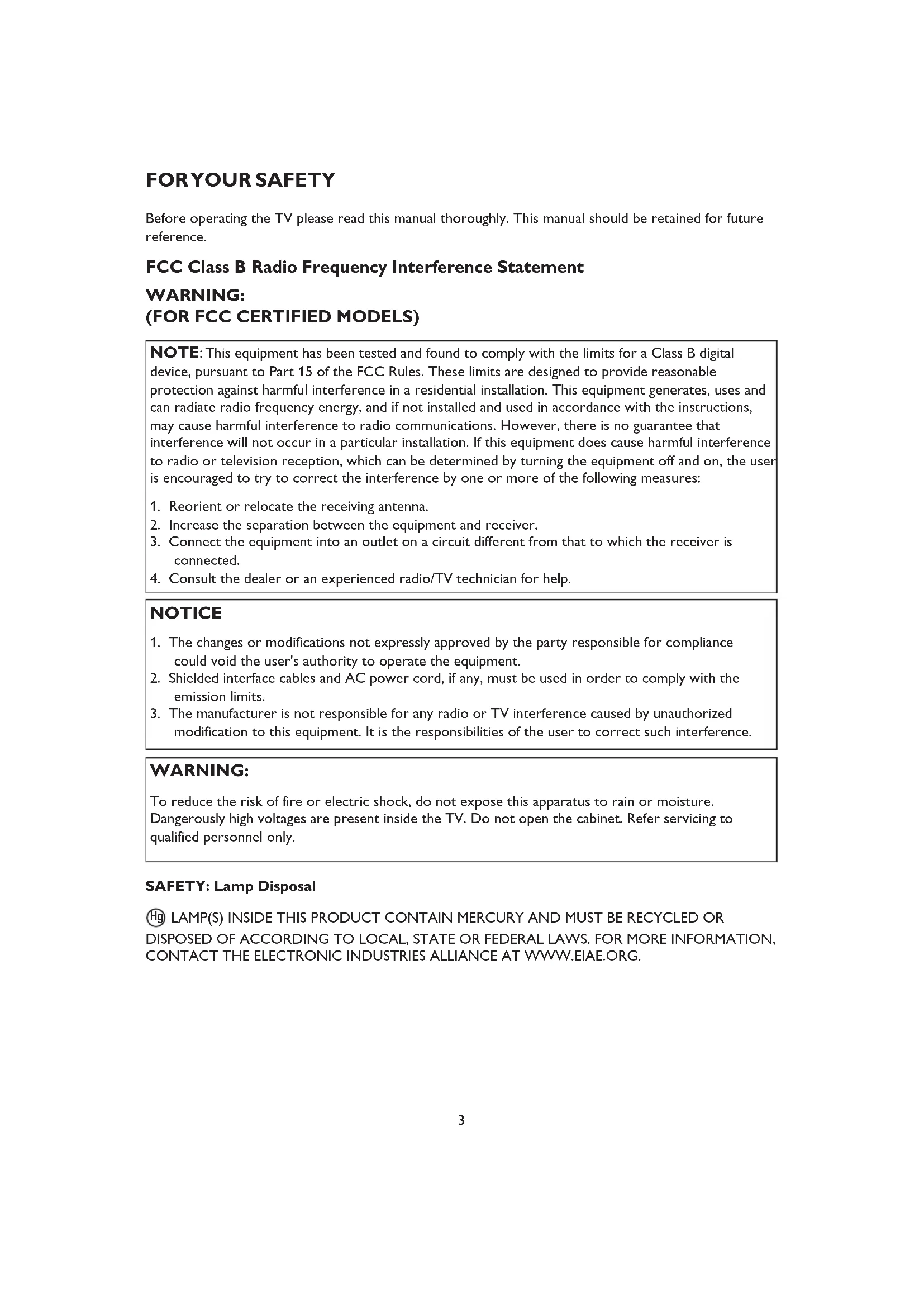 To reduce the risk of fire or electric shock, do not expose this apparatus to rain or moisture. Dangerously high voltages are present inside the TV. Do not open the cabinet. Refer servicing to qualified personnel only. SAFETY: Lamp Disposal