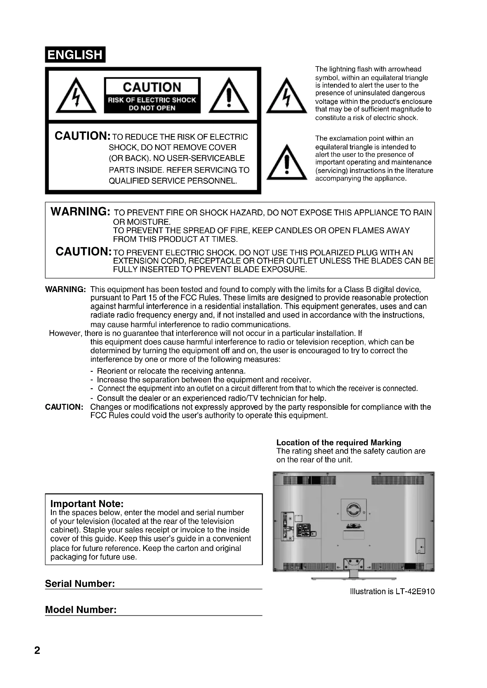 OR MOISTURE. TO PREVENT THE SPREAD OF FIRE, KEEP CANDLES OR OPEN FLAMES AWAY FROM THIS PRODUCT AT TIMES. CAUTION: TO PREVENT ELECTRIC SHOCK. DO NOT USE THIS POLARIZED PLUG WITH AN EXTENSION CORD, RECEPTACLE OR OTHER OUTLET UNLESS THE BLADES CAN BE FULLY INSERTED TO PREVENT BLADE EXPOSURE. Important Note: In the spaces below, enter the model and serial number of your television (located at the rear of the television cabinet). Staple your sales receipt or invoice to the inside cover of this guide. Keep this user’s guide in a convenient place for future reference. Keep the carton and original packaging for future use. Serial Number: Model Number: Illustration is LT-42E910 3CQ0221B_En.indd 23CQ0221B_En.indd 2 10/6/10 3:52:13 PM10/6/10 3:52:13 PM3 ENGLISH
