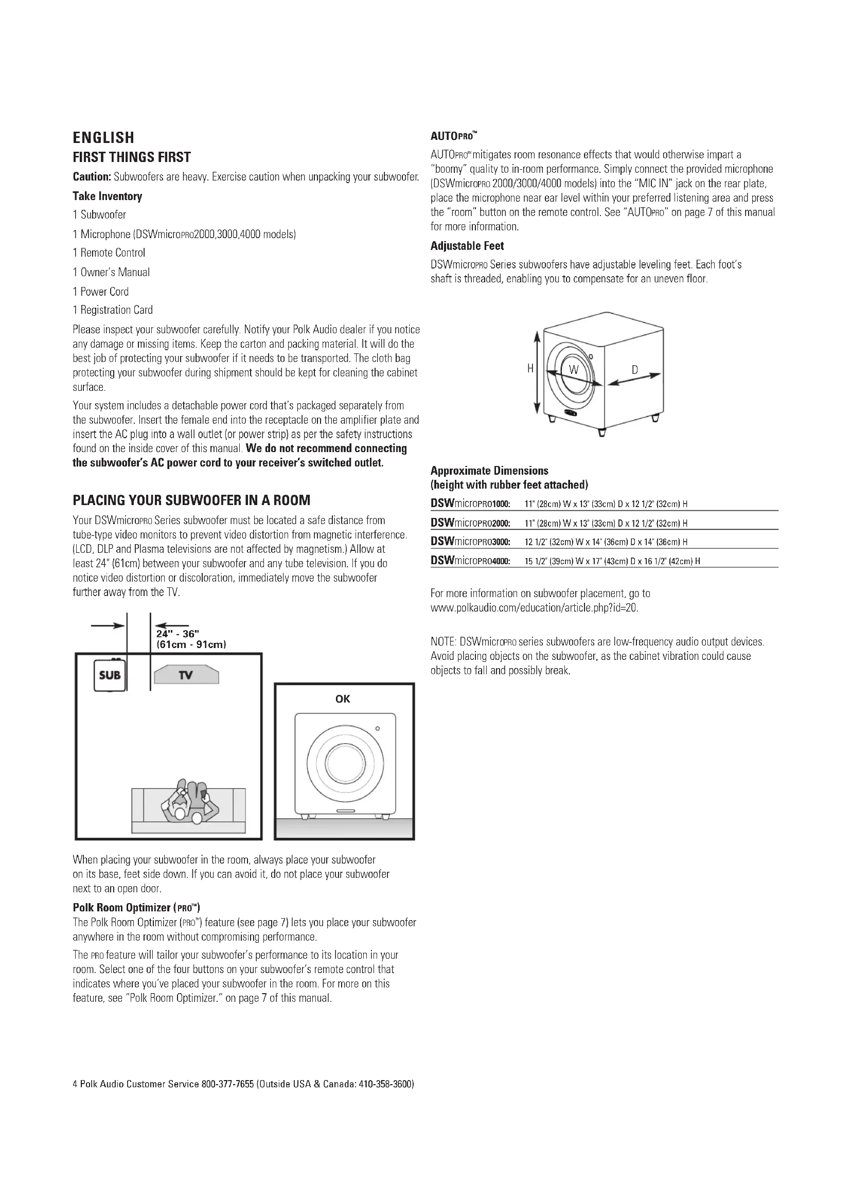 mitigates room resonance effects that would otherwise impart a “boomy” quality to in-room performance. Simply connect the provided microphone (DSWmicro PRO 2000/3000/4000 models) into the “MIC IN” jack on the rear plate, place the microphone near ear level within your preferred listening area and press the “room” button on the remote control. See “AUTO PRO” on page 7 of this manual for more information. Adjustable Feet DSWmicro PRO Series subwoofers have adjustable leveling feet. Each foot’s shaft is threaded, enabling you to compensate for an uneven floor. Approximate Dimensions (height with rubber feet attached) DSWmicroPRO1000: 11" (28cm) W x 13" (33cm) D x 12 1/2" (32cm) H DSWmicroPRO2000: 11" (28cm) W x 13" (33cm) D x 12 1/2" (32cm) H DSWmicroPRO3000: 12 1/2" (32cm) W x 14" (36cm) D x 14" (36cm) H DSWmicroPRO4000: 15 1/2" (39cm) W x 17" (43cm) D x 16 1/2" (42cm) H For more information on subwoofer placement, go to www.polkaudio.com/education/article.php?id=20. NOTE: DSWmicro PRO series subwoofers are low-frequency audio output devices. Avoid placing objects on the subwoofer, as the cabinet vibration could cause objects to fall and possibly break.