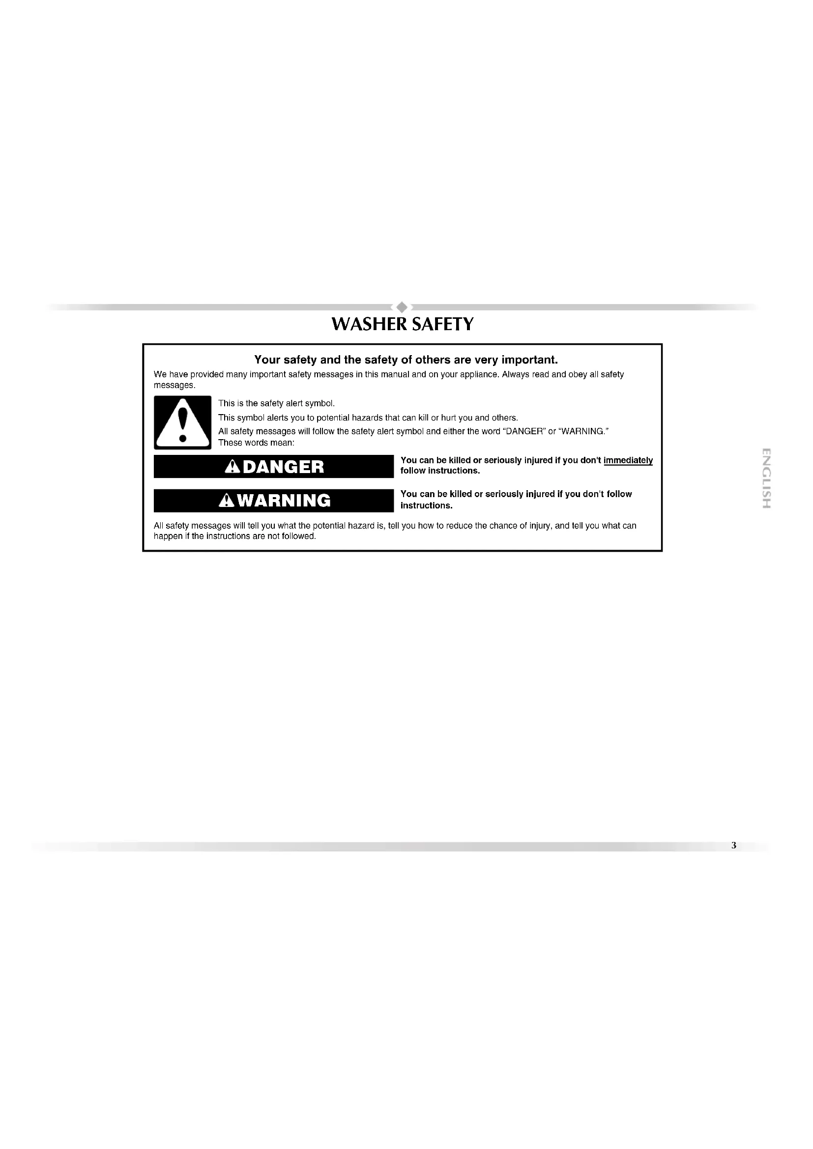 Aux États-Unis..................................................................74 Au Canada.......................................................................74 GARANTIE ..........................................................................753 WASHER SAFETY You can be killed or seriously injured if you don't immediately You can be killed or seriously injured if you don'tfollow All safety messages will tell you what the potential hazard is, tell you how to reduce the chance of injury, and tell you what can happen if the instructions are not followed. Your safety and the safety of others are very important. We have provided many important safety messages in this manual and on your appliance. Always read and obey all safety messages.This is the safety alert symbol.This symbol alerts you to potential hazards that can kill or hurt you and others.All safety messages will follow the safety alert symbol and either the word “DANGER” or “WARNING.”These words mean:follow instructions.instructions. DANGER WARNING4 INSTALLATION REQUIREMENTS Tools and Parts Gather the required tools and parts before starting installation. The parts supplied are in the washer basket. Tools needed for connecting the drain hose and water inlet hoses: NOTE: Replace inlet hoses after 5 years of use to reduce the risk of hose failure. Record hose installation or replacement dates for future reference. Parts supplied: