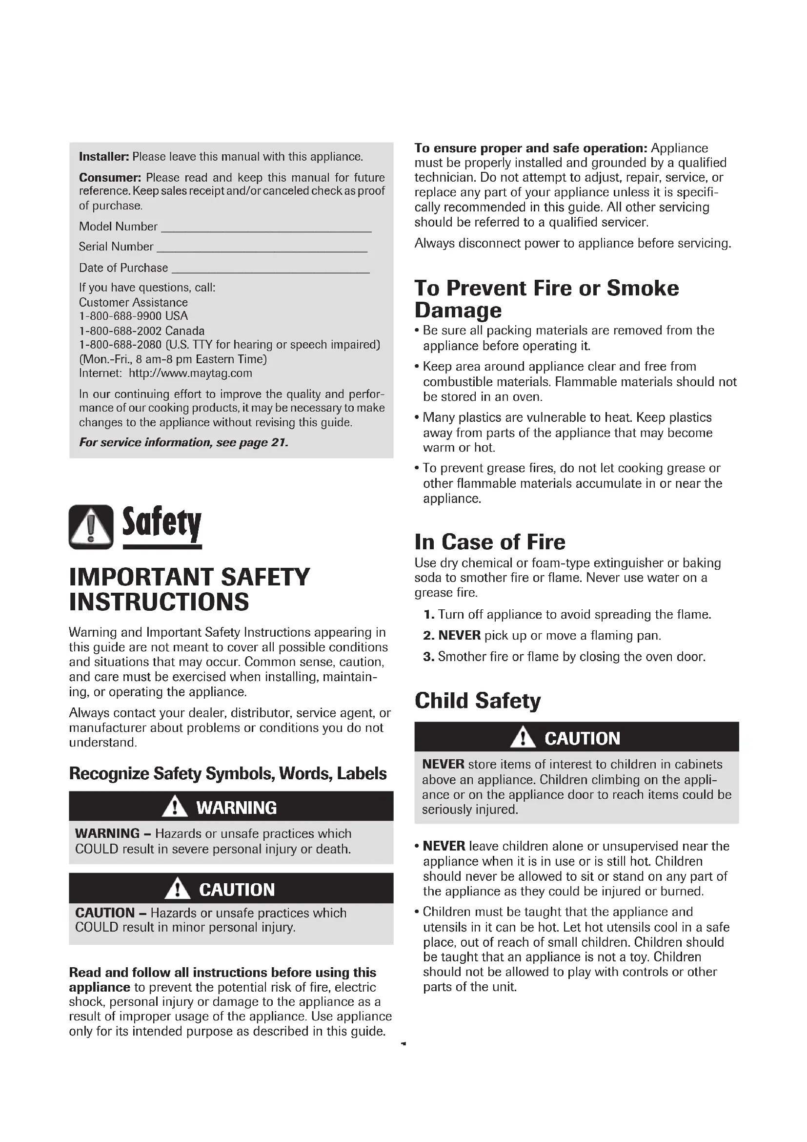 - Guía del Usuario Form No. A/01/08 Part No. w10169640Reviewed by Stewart, Steven | ReleasedRead and follow all instructions before using thisappliance to prevent the potential risk of fire, electricshock, personal injury or damage to the appliance as aresult of improper usage of the appliance. Use applianceonly for its intended purpose as described in this guide. Installer: Please leave this manual with this appliance.Consumer: Please read and keep this manual for futurereference. Keep sales receipt and/or canceled check as proofof purchase.Model Number __________________________________Serial Number __________________________________Date of Purchase ________________________________If you have questions, call:Customer Assistance1-800-688-9900 USA1-800-688-2002 Canada1-800-688-2080 (U.S. TTY for hearing or speech impaired)(Mon.-Fri., 8 am-8 pm Eastern Time)Internet: http://www.maytag.comIn our continuing effort to improve the quality and perfor-mance of our cooking products, it may be necessary to makechanges to the appliance without revising this guide.For service information, see page 21. IMPORTANT SAFETY INSTRUCTIONS Warning and Important Safety Instructions appearing inthis guide are not meant to cover all possible conditionsand situations that may occur. Common sense, caution,and care must be exercised when installing, maintain-ing, or operating the appliance.Always contact your dealer, distributor, service agent, ormanufacturer about problems or conditions you do notunderstand.To ensure proper and safe operation: Appliancemust be properly installed and grounded by a qualifiedtechnician. Do not attempt to adjust, repair, service, orreplace any part of your appliance unless it is specifi-cally recommended in this guide. All other servicingshould be referred to a qualified servicer.Always disconnect power to appliance before servicing. To Prevent Fire or Smoke Damage p. 44