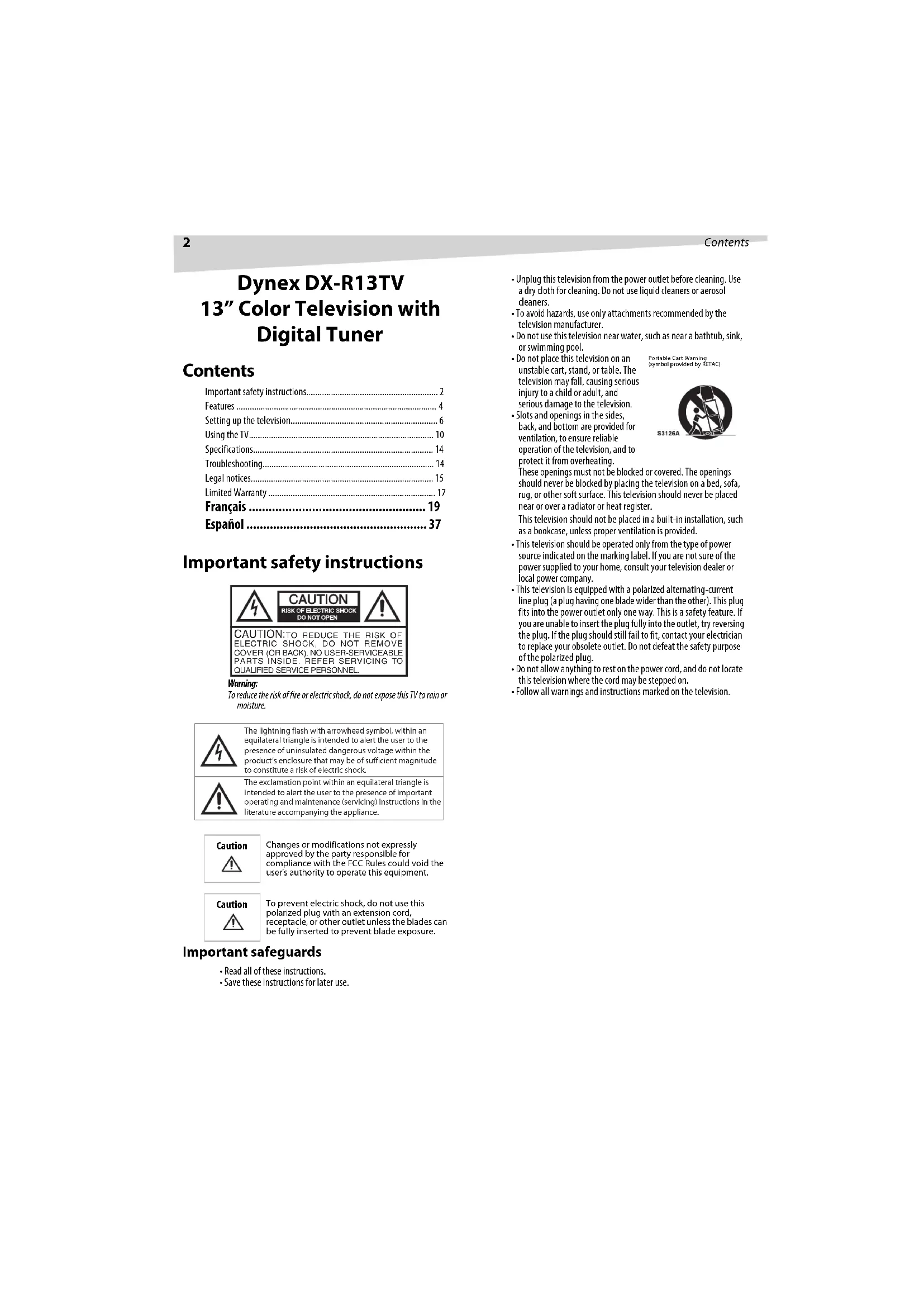 - USER GUIDE • GUIDE DE L’UTILISATEUR • GUÍA DEL USUARIO 13” Color Television with Digital Tuner Téléviseur Couleur de 13” po avec Syntoniseur Numérique Televisor a Color de 13” con Sintonizador Digital DX-R13TV2 Contents Dynex DX-R13TV 13” Color Television with Digital Tuner Contents Important safety instructions p. 2