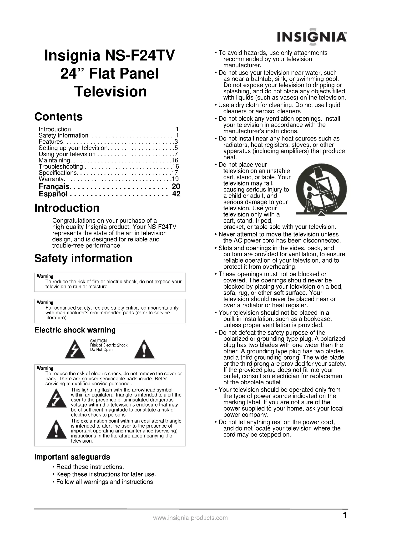 - Do not let anything rest on the power cord, and do not locate your television where the cord may be stepped on. WarningTo reduce the risk of fire or electric shock, do not expose your television to rain or moisture.WarningFor continued safety, replace safety critical components only with manufacturer’s recommended parts (refer to service literature).WarningTo reduce the risk of electric shock, do not remove the cover or back. There are no user-serviceable parts inside. Refer servicing to qualified service personnel.This lightning flash with the arrowhead symbol within an equilateral triangle is intended to alert the user to the presence of uninsulated dangerous voltage within the television’s enclosure that may be of sufficient magnitude to constitute a risk of electric shock to persons.The exclamation point within an equilateral triangle is intended to alert the user to the presence of important operating and maintenance (servicing) instructions in the literature accompanying the television.CAUTIONRisk of Electric ShockDo Not Open2 Insignia NS-F24TV 24” Flat Panel Television www.insignia-products.com