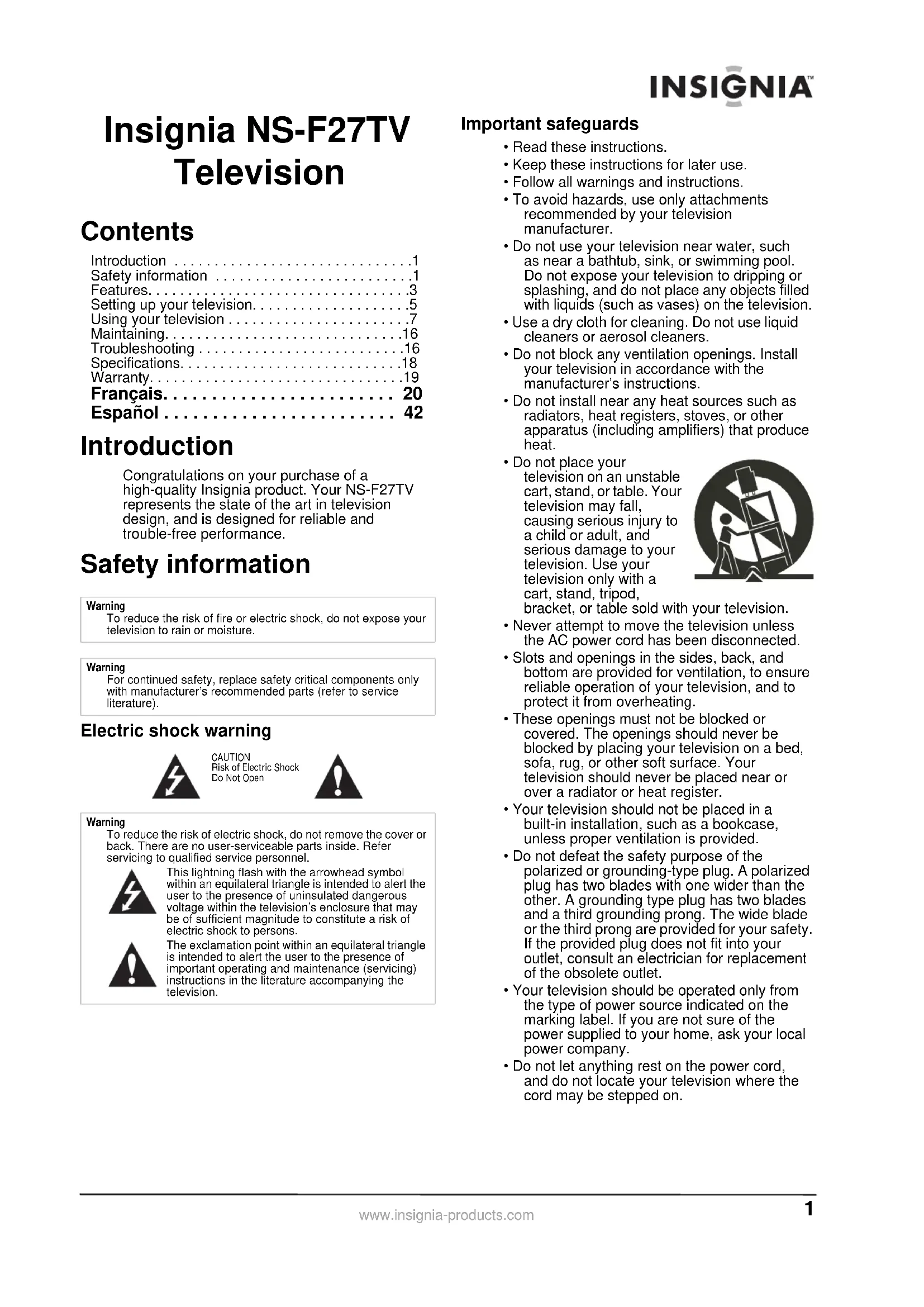 - Garantie Introduction Félicitations d’avoir acheté ce produit Insignia de haute qualité. Le modèle NS-F27TV représente la dernière avancée technologique dans la conception de téléviseur et a été conçu pour des performances et une fiabilité exceptionnelles. Informations sur la sécurité Avertissement sur le risque de choc électrique Importantes mesures de sécurité p. 41