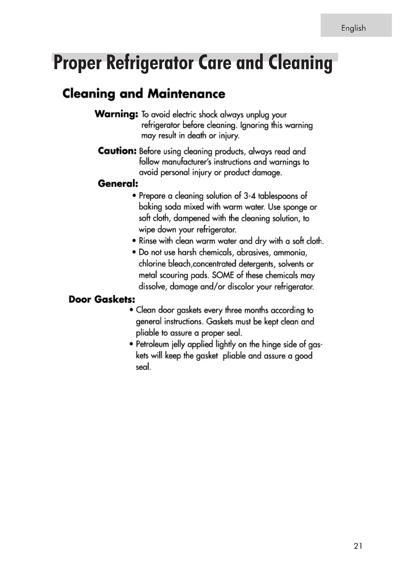 Proper Refrigerator Care and Cleaning 21English “General cleaning” section pg. 21.