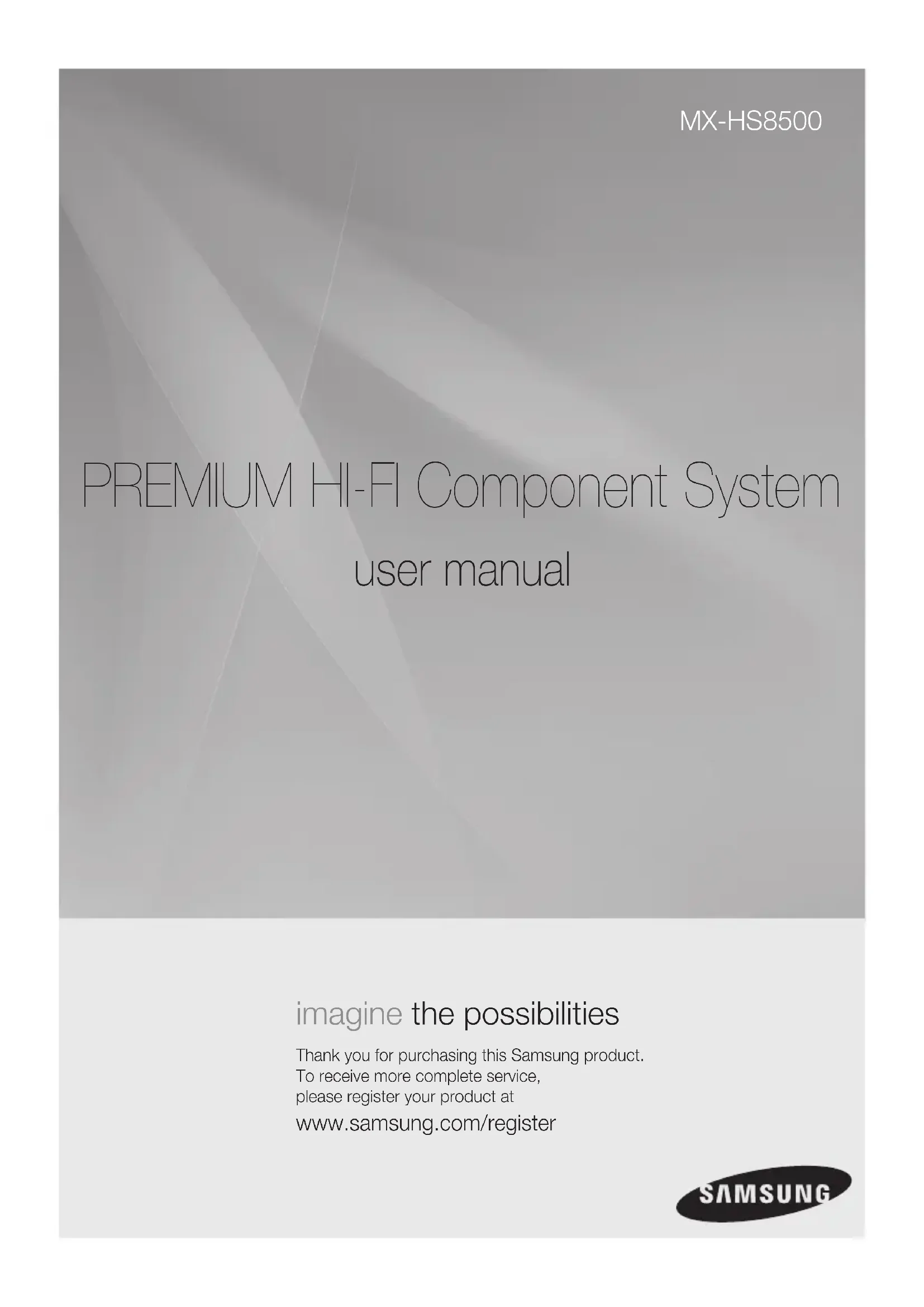 PREMIUM HI-FI Component System user manual MX-HS8500 imagine the possibilities Thank you for purchasing this Samsung product. To receive more complete service, please register your product at www.samsung.com/register [MX-HS8500-ZC]AH68-02706B-03ENG.indd 1 2014-05-26 오후 6:12:56Safety Information