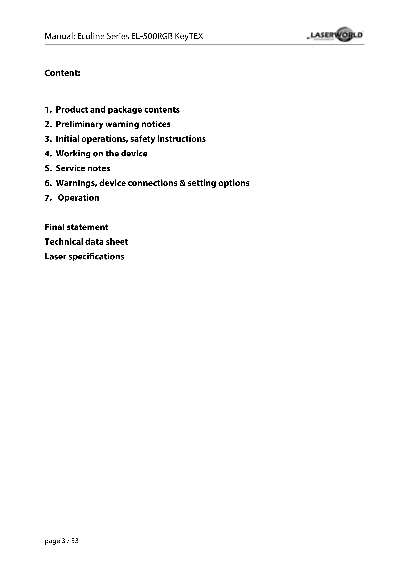5 0 - 255 pattern drawing with speed selection 6 0 - 255 zoom in with speed selection 7 0 - 255 y-axis rotation with manual speed selection 8 0 - 255 x-axis rotation with manual speed selection 9 0 - 255 z-axis rotation with manual speed selection 10 0 - 255 x-axis movement with manual speed selection 11 0 - 255 y-axis movement with manual speed selection 12 0 - 255 stretch eect Please note that not each pattern can be combined with each eect! DMX Mode Press to select the mode and press ‚ENTER‘ to activate the mode. When DMX mode is acti- ve, use the following keys on the keyboard:Manual: Ecoline Series EL-500RGB KeyTEX page 12 / 33 Final statement Laserworld products are tested and product packaging is inspected before leaving our warehouse. Users must to follow the local safety regulations and warnings within this manual and adhere to any regulations within its place of use. Damages through inappropriate use will void any liability or warranty of our products. Due to continual product developments, please check for the latest update of this product manual at www.laserworld.com. If you do have any further questions, then please contact your dealer/place of purchase or use our contact section on our website. For service issues, please contact your dealer/place of purchase and ensure only genuine Laserworld spare parts are used in any service repairs. Errors and Omissions excepted and products are subject to change. Laserworld (Switzerland) AG Kreuzlingerstrasse 5 8574 Lengwil SWITZERLAND Registered oce: 8574 Lengwil / Switzerland Company number: CH-440.3.020.548-6 Commercial Registry Kanton Thurgau CEO: Martin Werner VAT no. (Switzerland): 683 180 UID (Switzerland): CHE-113.954.889 VAT no. (Germany): DE258030001 WEEE-Reg.-No. (Germany): DE 90759352 www.laserworld.com info@laserworld.com representative according to EMVG: Ray Technologies GmbH Managing Director: Karl-Heinz Käs Mühlbachweg 2 83626 Valley / GermanyManual: Ecoline Series EL-500RGB KeyTEX page 13 / 33 Inhaltverzeichnis: