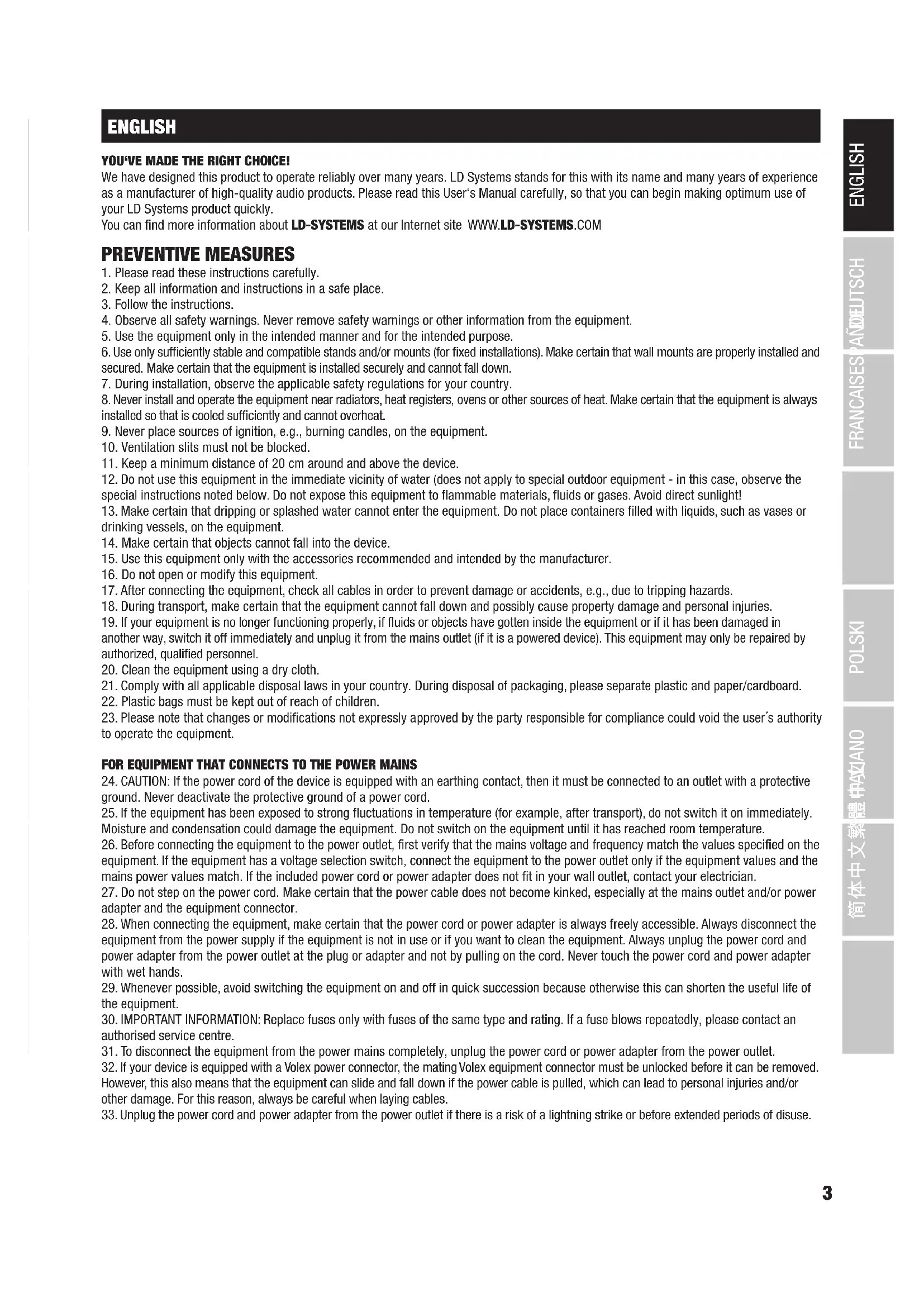 ENGLISH YOU‘VE MADE THE RIGHT CHOICE! We have designed this product to operate reliably over many years. LD Systems stands for this with its name and many years of experience as a manufacturer of high-quality audio products. Please read this User‘s Manual carefully, so that you can begin making optimum use of your LD Systems product quickly. You can find more information about LD-SYSTEMS at our Internet site WWW.LD-SYSTEMS.COM PREVENTIVE MEASURES