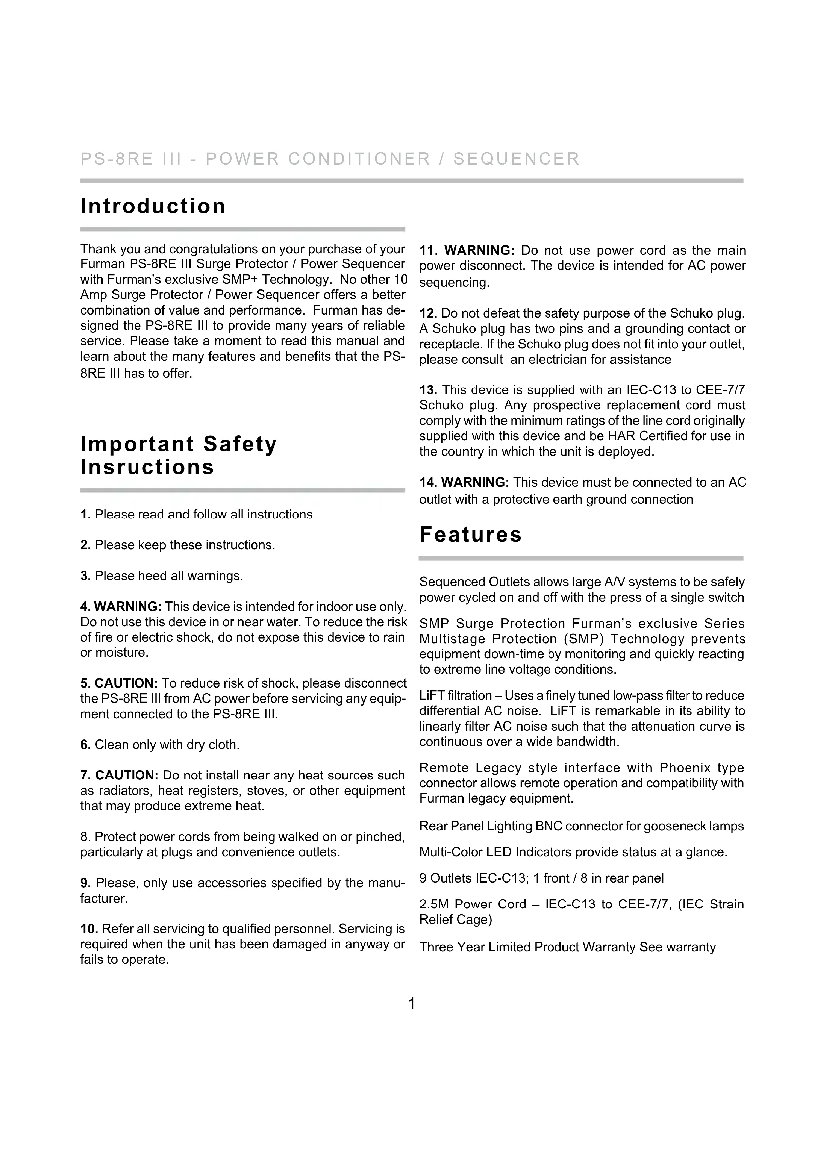 outlet with a protective earth ground connection Introduction Important Safety Insructions Features PS-8RE III - POWER CONDITIONER / SEQUENCER2 AV equipment is most vulnerable and susceptible to dam- age during those first few milliseconds after the power is turned on or off. When audio amplifiers are powered on, a large inrush current occurs as the large capacitors in the power supply charge. This inrush can be on the order of several hundred amps for a number of AC cycles. If more than one amplifier is connected to a single branch circuit, the inrush current is multiplied and can cause the circuit breaker to trip, or the line voltage to sag. Additionally, if the amplifier is pow- ered on either before or concurrent with signal processing equipment, the result can be a dreaded speaker “pop”. This all-too familiar noise occurs as transients from the signal processing equipment flow uncontrolled to the inputs of the power amplifier. The amplifier amplifies this signal and passes the transient “pop” along to the speakers. The result can be catastrophic to both speaker and amplifier. Powering down A/V is equally as perilous. Unlike other A/V equipment, the large capacitors found in amplifiers will store their charge. This means if signal processing devices and amplifiers are switched off simultaneously, the amplifiers are still operational as the signal processing equipment is switched off. Just as with startup, the power down phase can cause equipment to emit transients which are amplified by the amplifier, then propagated to the speakers and “pop”! AC Power sequencing addresses these problems by pow- ering up your equipment in stages. The signal processing equipment is powered on first and allowed to stabilize, and then the amplifiers are powered on. The first stage signal processing equipment may still emit transient noise upon power up, but because the amplifiers have yet to power on, the transient signal passes without incident. Power sequencing stages the activation of heavy loads, which prevents nuisance breaker trips and equipment damage due to line sags and brown-outs. This means that inrush currents are offset in time, rather than occurring simultaneously. This can also be advantageous to upstream equipment if the sequencer is supplement- ing other power management such as a UPS or voltage regulator. The Furman PS-8RE III provides three delay stages. If three stages of power sequencing are not enough for your application, you can chain together multiple PS-8RE III sequencers. For best results we recommend that your power amplifiers always receive power last. Plug the am- plifiers into DELAY 3, or divide them into two groups and plug one group into DELAY 2, and the other into DELAY