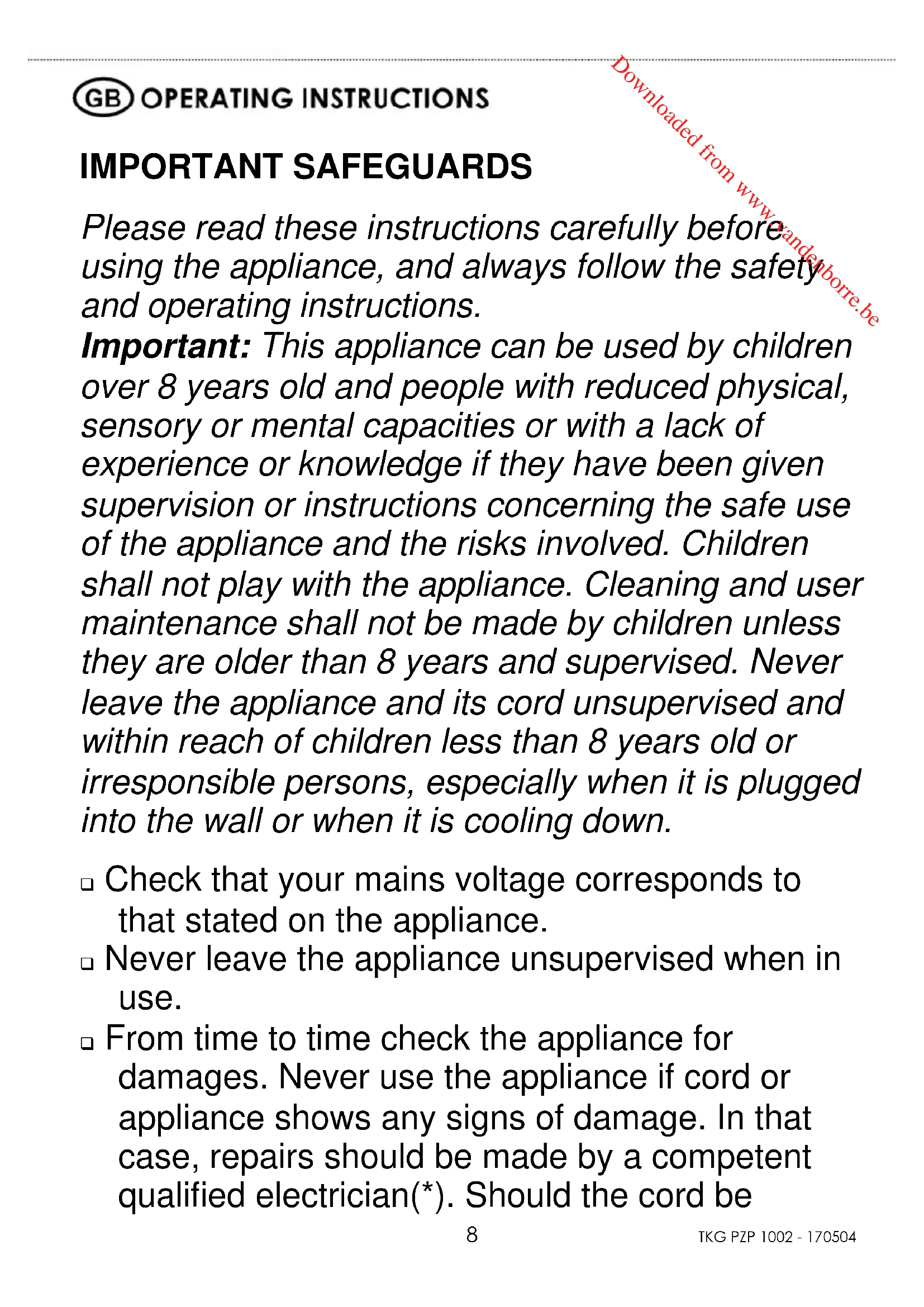 IMPORTANT SAFEGUARDS Please read these instructions carefully before using the appliance, and always follow the safety and operating instructions. Important: This appliance can be used by children over 8 years old and people with reduced physical, sensory or mental capacities or with a lack of experience or knowledge if they have been given supervision or instructions concerning the safe use of the appliance and the risks involved. Children shall not play with the appliance. Cleaning and user maintenance shall not be made by children unless they are older than 8 years and supervised. Never leave the appliance and its cord unsupervised and within reach of children less than 8 years old or irresponsible persons, especially when it is plugged into the wall or when it is cooling down. Check that your mains voltage corresponds to that stated on the appliance. Never leave the appliance unsupervised when in use. From time to time check the appliance for damages. Never use the appliance if cord or appliance shows any signs of damage. In that case, repairs should be made by a competent qualified electrician(*). Should the cord be Downloaded from www.vandenborre.beCopies of the I/B. Please reproduce them without any changes except under special instruction from Team International BELGIUM. The pages must be reproduced and folded in order to obtain a booklet A5 (+/- 148.5 mm width x 210 mm height). When folding, make sure you keep the good numbering when you turn the pages of the I/B. Don’t change the page numbering. Keep the language integrity.