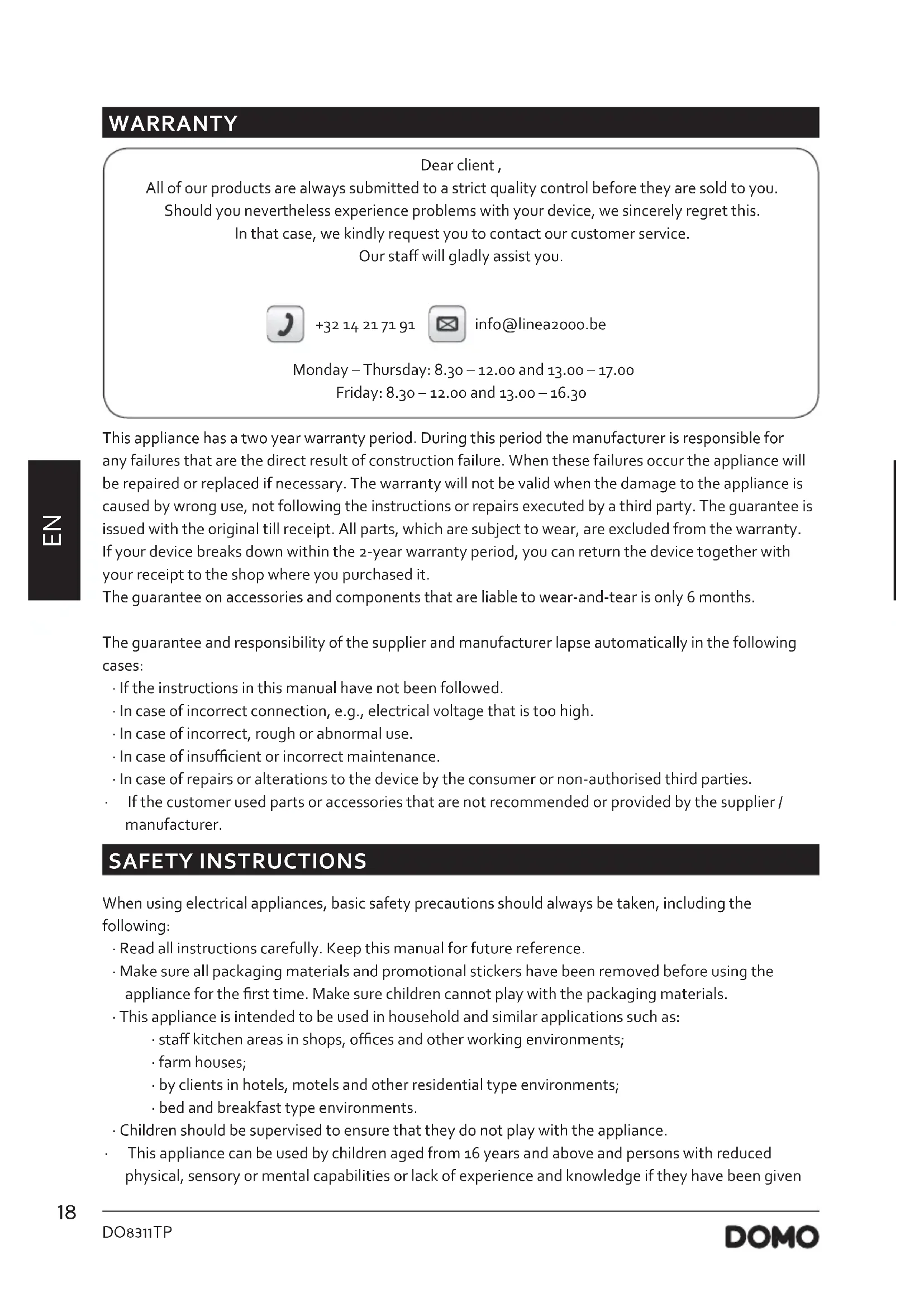 WARRANTY Dear client , All of our products are always submitted to a strict quality control before they are sold to you. Should you nevertheless experience problems with your device, we sincerely regret this. In that case, we kindly request you to contact our customer service. Our sta will gladly assist you. +32 14 21 71 91 info@linea2000.be Monday – Thursday: 8.30 – 12.00 and 13.00 – 17.00 Friday: 8.30 – 12.00 and 13.00 – 16.30 This appliance has a two year warranty period. During this period the manufacturer is responsible for any failures that are the direct result of construction failure. When these failures occur the appliance will be repaired or replaced if necessary. The warranty will not be valid when the damage to the appliance is caused by wrong use, not following the instructions or repairs executed by a third party. The guarantee is issued with the original till receipt. All parts, which are subject to wear, are excluded from the warranty. If your device breaks down within the 2-year warranty period, you can return the device together with your receipt to the shop where you purchased it. The guarantee on accessories and components that are liable to wear-and-tear is only 6 months. The guarantee and responsibility of the supplier and manufacturer lapse automatically in the following cases: