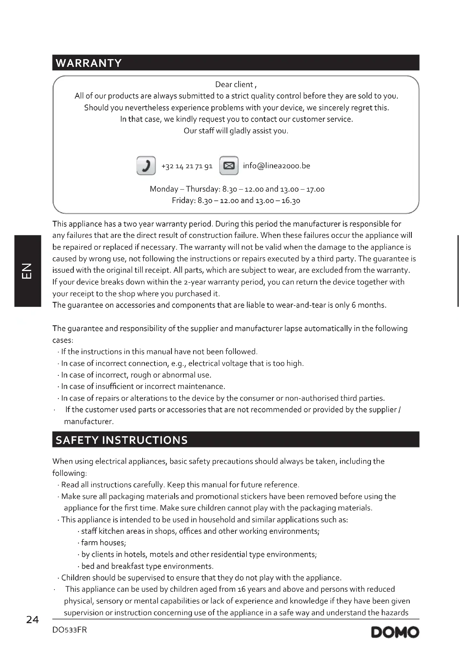 WARRANTY Dear client , All of our products are always submitted to a strict quality control before they are sold to you. Should you nevertheless experience problems with your device, we sincerely regret this. In that case, we kindly request you to contact our customer service. Our sta will gladly assist you. +32 14 21 71 91 info@linea2000.be Monday – Thursday: 8.30 – 12.00 and 13.00 – 17.00 Friday: 8.30 – 12.00 and 13.00 – 16.30 This appliance has a two year warranty period. During this period the manufacturer is responsible for any failures that are the direct result of construction failure. When these failures occur the appliance will be repaired or replaced if necessary. The warranty will not be valid when the damage to the appliance is caused by wrong use, not following the instructions or repairs executed by a third party. The guarantee is issued with the original till receipt. All parts, which are subject to wear, are excluded from the warranty. If your device breaks down within the 2-year warranty period, you can return the device together with your receipt to the shop where you purchased it. The guarantee on accessories and components that are liable to wear-and-tear is only 6 months. The guarantee and responsibility of the supplier and manufacturer lapse automatically in the following cases: