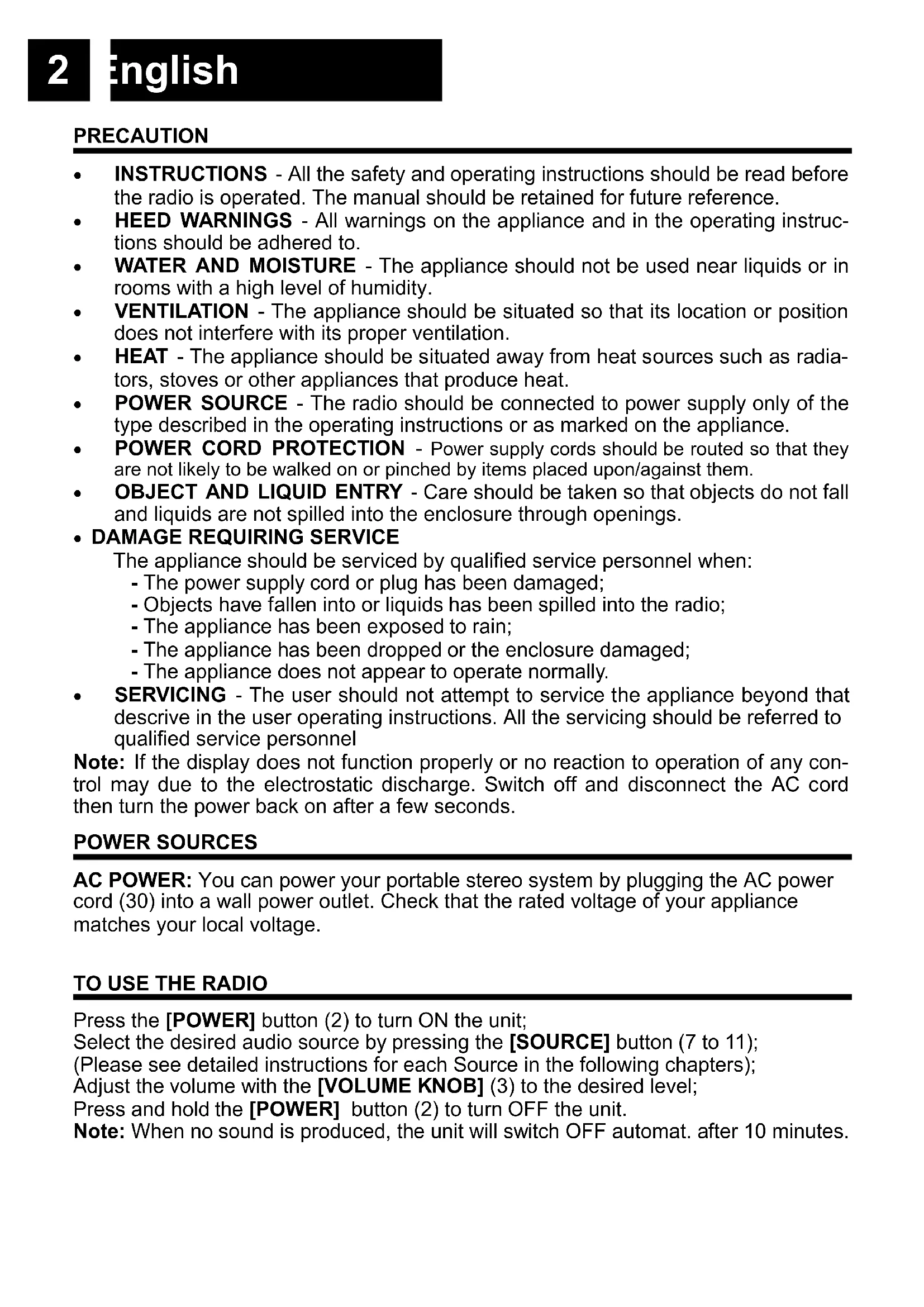 - SERVICING - The user should not attempt to service the appliance beyond that descrive in the user operating instructions. All the servicing should be referred to qualified service personnel Note: If the display does not function properly or no reaction to operation of any con- trol may due to the electrostatic discharge. Switch off and disconnect the AC cord then turn the power back on after a few seconds. POWER SOURCES AC POWER: You can power your portable stereo system by plugging the AC power cord (30) into a wall power outlet. Check that the rated voltage of your appliance matches your local voltage.