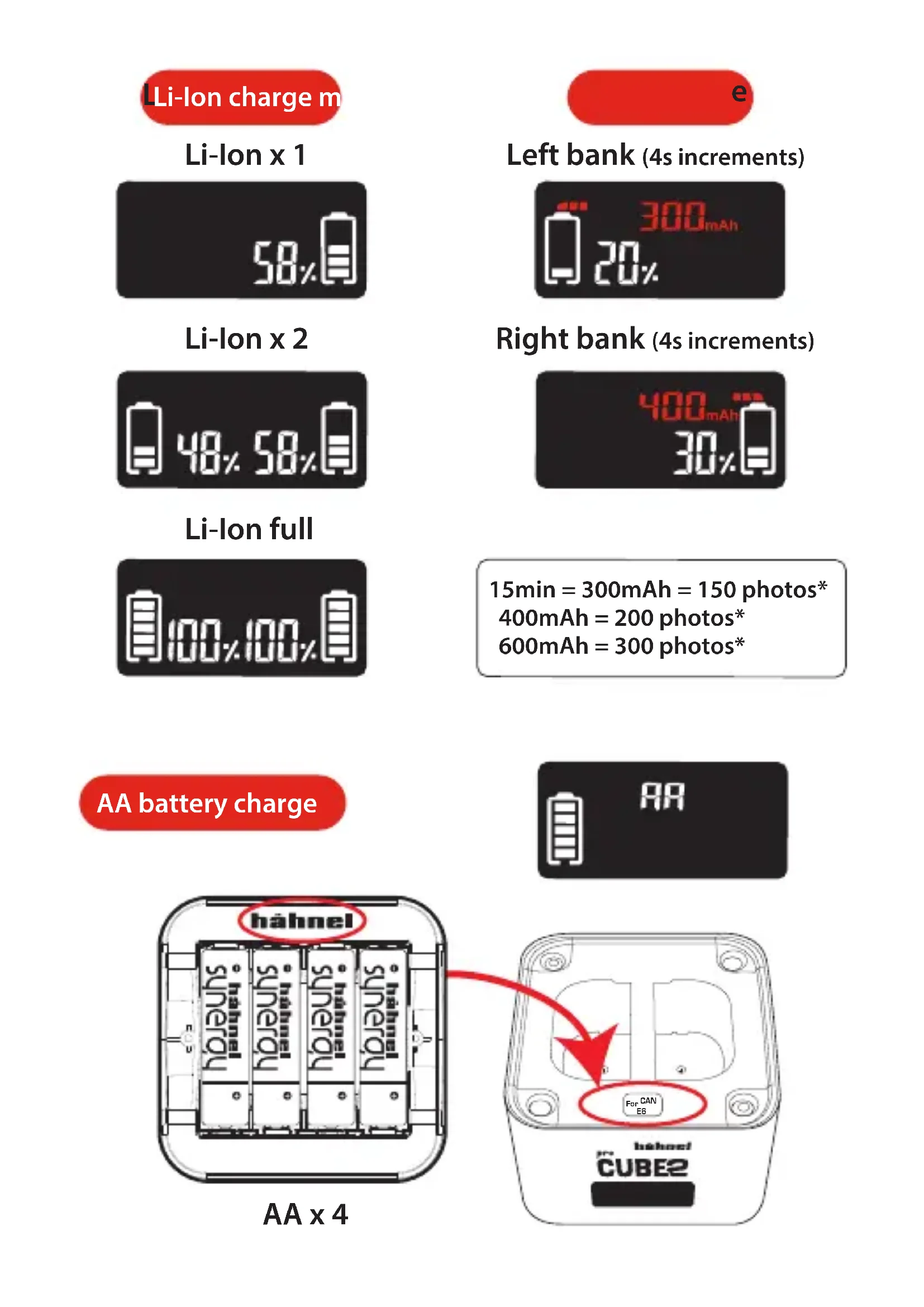 Left bank (4s increments) Right bank (4s increments) Li-Ion Charge AA x 4 mAh Charge Li-Ion x 1 Li-Ion x 2 Li-Ion full 15min = 300mAh = 150 photos* 400mAh = 200 photos* 600mAh = 300 photos* Power Li-Ion charge mAh charge AA battery chargeEN