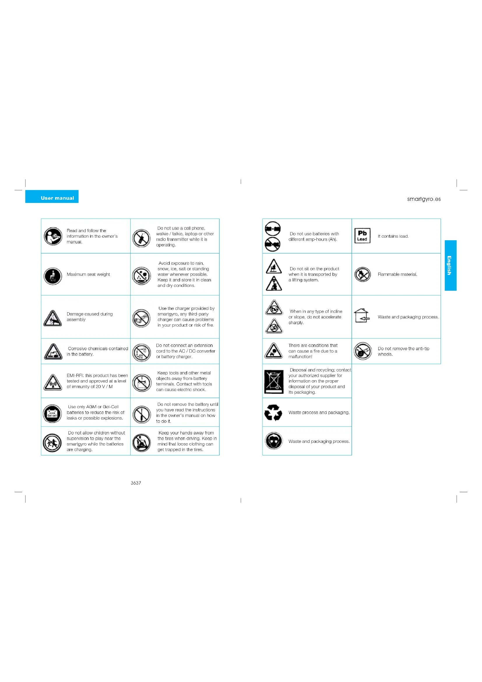 Before using your scooter, make sure your delivery is complete, as some components may be packaged individually. If you do not receive a complete delivery, contact your authorized provider immediately. PRODUCT SECURITY The following symbols are used on the Avanza scooter to identify warnings, mandatory actions and prohibitions. It is very important that you read them and understand them com- pletely..36 37 English User manual smartgyro.es Read and follow the information in the owner’s manual. Do not use a cell phone, walkie / talkie, laptop or other radio transmitter while it is operating. Do not use batteries with different amp-hours (Ah). It contains lead. Maximum seat weight Avoid exposure to rain, snow, ice, salt or standing water whenever possible. Keep it and store it in clean and dry conditions. Do not sit on the product when it is transported by a lifting system. Flammable material. Damage caused during assembly Use the charger provided by smartgyro, any third-party charger can cause problems in your product or risk of fire. When in any type of incline or slope, do not accelerate sharply. Waste and packaging process. Corrosive chemicals contained in the battery. Do not connect an extension cord to the AC / DC converter or battery charger. There are conditions that can cause a fire due to a malfunction! Do not remove the anti-tip wheels. EMI-RFI: this product has been tested and approved at a level of immunity of 20 V / M Keep tools and other metal objects away from battery terminals. Contact with tools can cause electric shock. Disposal and recycling: contact your authorized supplier for information on the proper disposal of your product and its packaging. Use only AGM or Gel-Cell batteries to reduce the risk of leaks or possible explosions. Do not remove the battery until you have read the instructions in the owner’s manual on how to do it. Waste process and packaging. Do not allow children without supervision to play near the smartgyro while the batteries are charging. Keep your hands away from the tires when driving. Keep in mind that loose clothing can get trapped in the tires. Waste and packaging process.38 39 English User manual smartgyro.es GENERAL Do not drive your new Scooter for the first time without having read and fully understood this user manual. Smartgyro Avanza is a vehicle designed to improve your comfort. We offer a wide variety of products to better adapt to the individual needs of the user. The content of this manual is based on the expectation of a team of experts in mobility devices who have adjusted the smartGyro Avanza properly and have helped the prescribing health professional and / or the authorized provider in the process of instructions for use. of the product. There are certain situations, including some medical conditions, in which the smartGyro Avanza user will have to practice their management in the presence of a trained assistant. A trained assistant can be defined as a family member or health professional specially trained to help a user in various activities of daily life. When you start using your SmartGyro Avanza during your daily activities, you will probably encounter situations where you will need some practice. Just take your time and soon you will have full and confident control as you maneuver through doors, elevations and descents of elevators, ascent ramps and on terrains with uneven surfaces. Here are some precautions, tips, and other safety considerations that will help you get used to driving with the SmartGyro Avanza safely. MODIFICATIONS Our scooter has been designed to provide you maximum mobility and usefulness. However, under no circumstances should you modify, add, delete or disable any part of your Smart- Gyro Avanza. Do not modify your SmartGyro Avanza in any way. Do not use third-party parts. Do not attempt to lift or move your SmartGyro Avanza by any of its removable parts, such as the armrests or the seat.