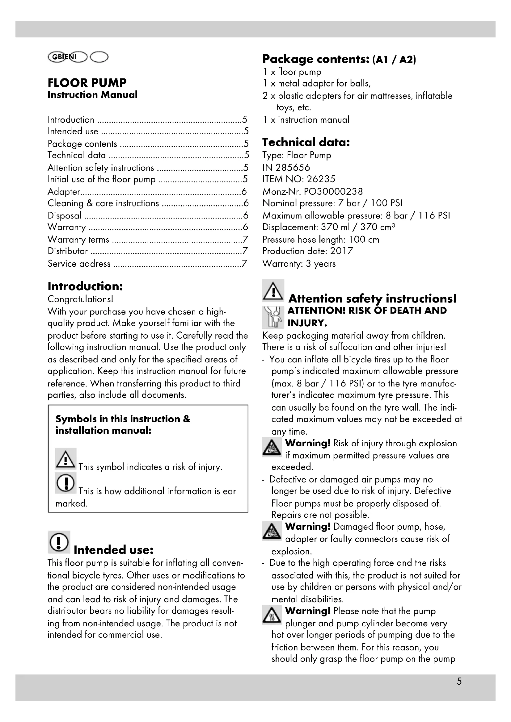 Intended use: This floor pump is suitable for inflating all conven-tional bicycle tyres. Other uses or modifications to the product are considered non-intended usage and can lead to risk of injury and damages. The distributor bears no liability for damages result-ing from non-intended usage. The product is not intended for commercial use. Package contents: (A1 / A2) 1 x floor pump1 x metal adapter for balls,2 x plastic adapters for air mattresses, inflatable toys, etc.1 x instruction manual Technical data: Type: Floor PumpIN 285656ITEM NO: 26235Monz-Nr. PO30000238Nominal pressure: 7 bar / 100 PSIMaximum allowable pressure: 8 bar / 116 PSIDisplacement: 370 ml / 370 cm³Pressure hose length: 100 cmProduction date: 2017Warranty: 3 years