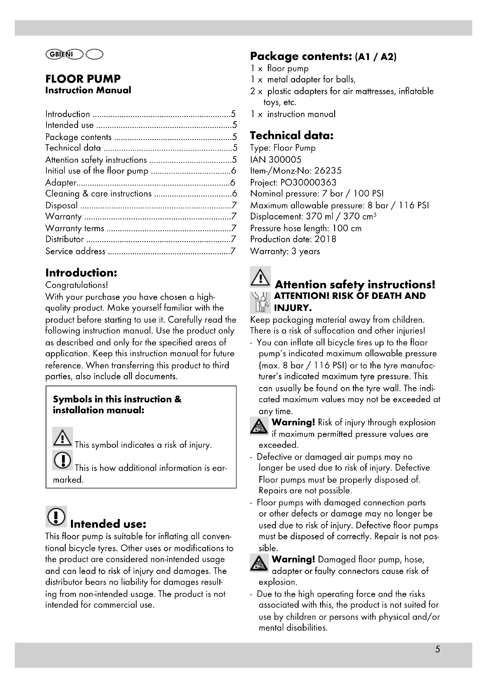 Intended use: This floor pump is suitable for inflating all conven-tional bicycle tyres. Other uses or modifications to the product are considered non-intended usage and can lead to risk of injury and damages. The distributor bears no liability for damages result-ing from non-intended usage. The product is not intended for commercial use. Package contents: (A1 / A2) 1 x floor pump1 x metal adapter for balls,2 x plastic adapters for air mattresses, inflatable toys, etc.1 x instruction manual Technical data: Type: Floor PumpIAN 300005Item-/Monz-No: 26235Project: PO30000363Nominal pressure: 7 bar / 100 PSIMaximum allowable pressure: 8 bar / 116 PSIDisplacement: 370 ml / 370 cm³Pressure hose length: 100 cmProduction date: 2018Warranty: 3 years
