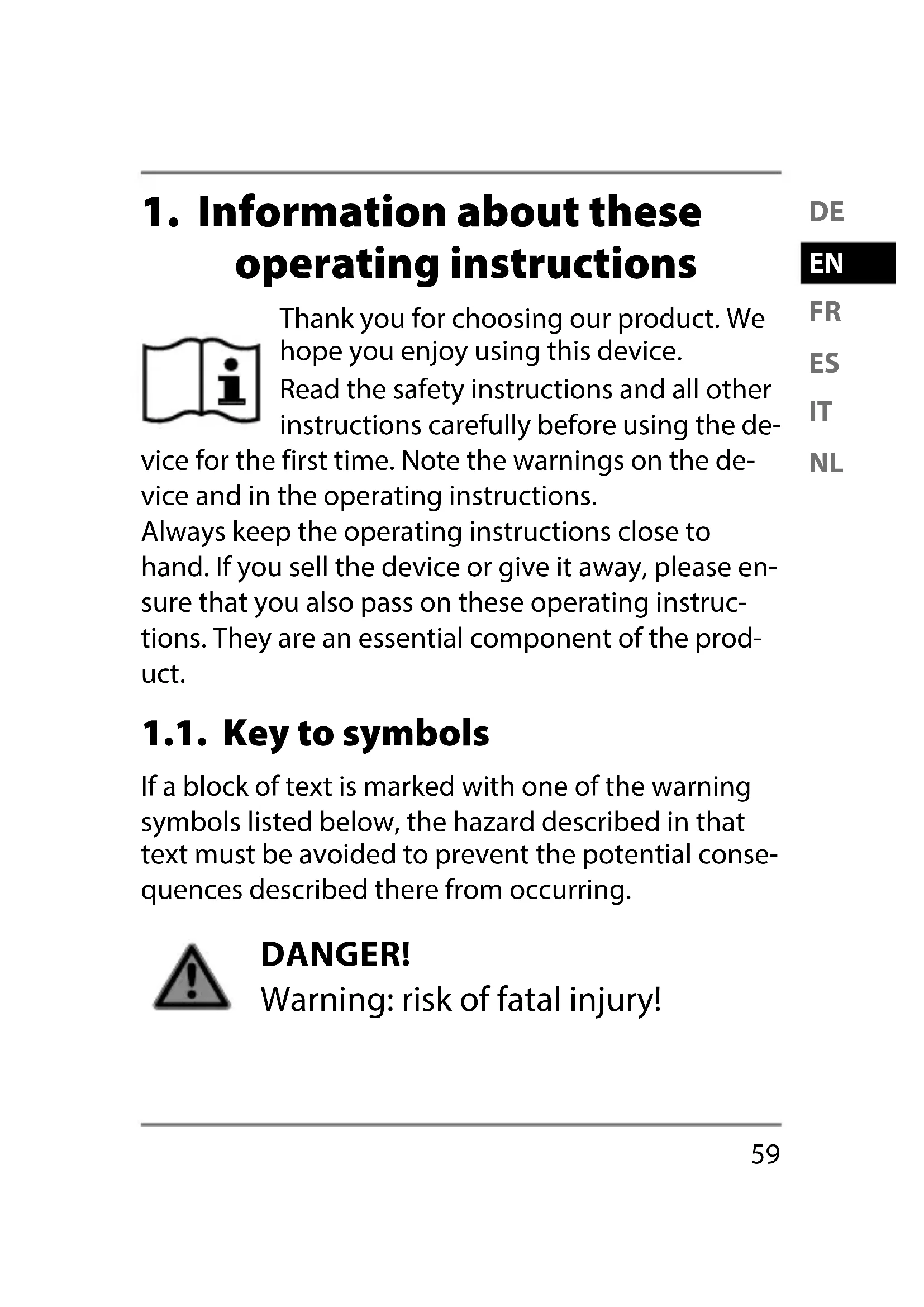 operating instructions Thank you for choosing our product. We hope you enjoy using this device. Read the safety instructions and all other instructions carefully before using the de- vice for the first time. Note the warnings on the de- vice and in the operating instructions. Always keep the operating instructions close to hand. If you sell the device or give it away, please en- sure that you also pass on these operating instruc- tions. They are an essential component of the prod- uct. 1.1. Key to symbols If a block of text is marked with one of the warning symbols listed below, the hazard described in that text must be avoided to prevent the potential conse- quences described there from occurring. DANGER!