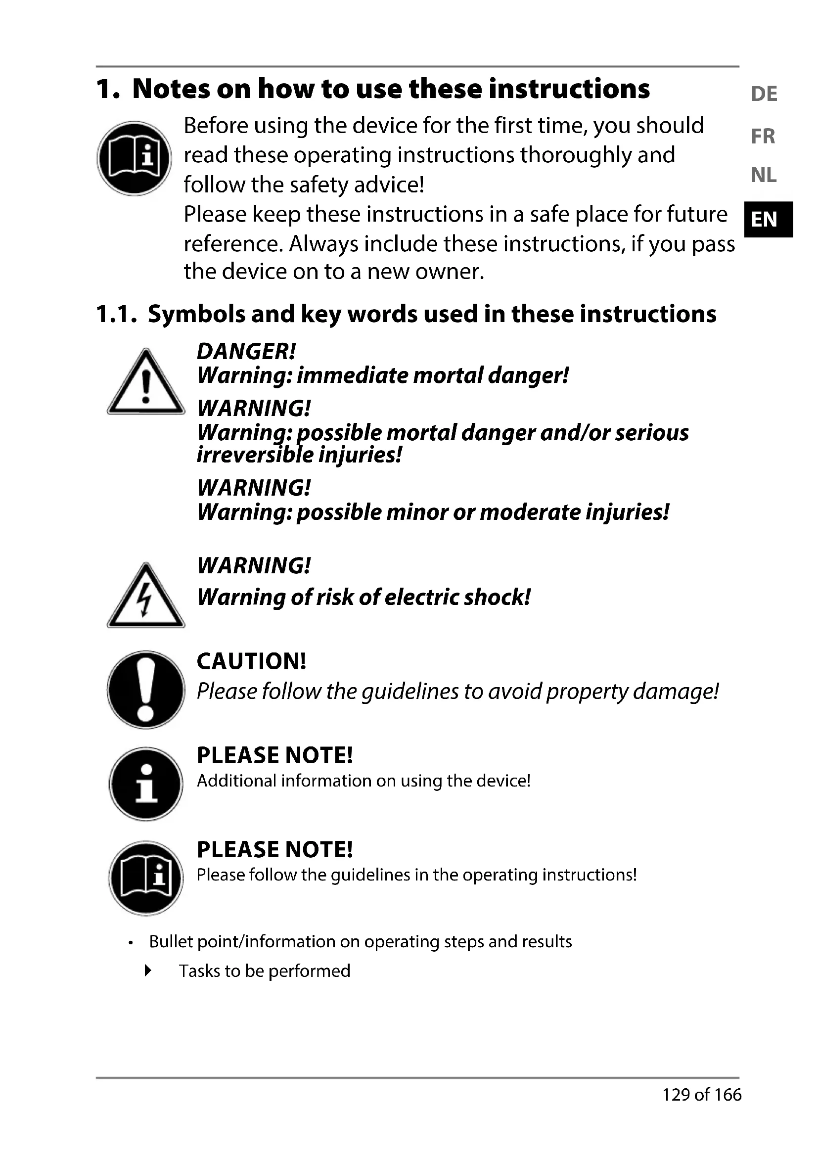 Before using the device for the first time, you should read these operating instructions thoroughly and follow the safety advice! Please keep these instructions in a safe place for future reference. Always include these instructions, if you pass the device on to a new owner. 1.1. Symbols and key words used in these instructions DANGER!