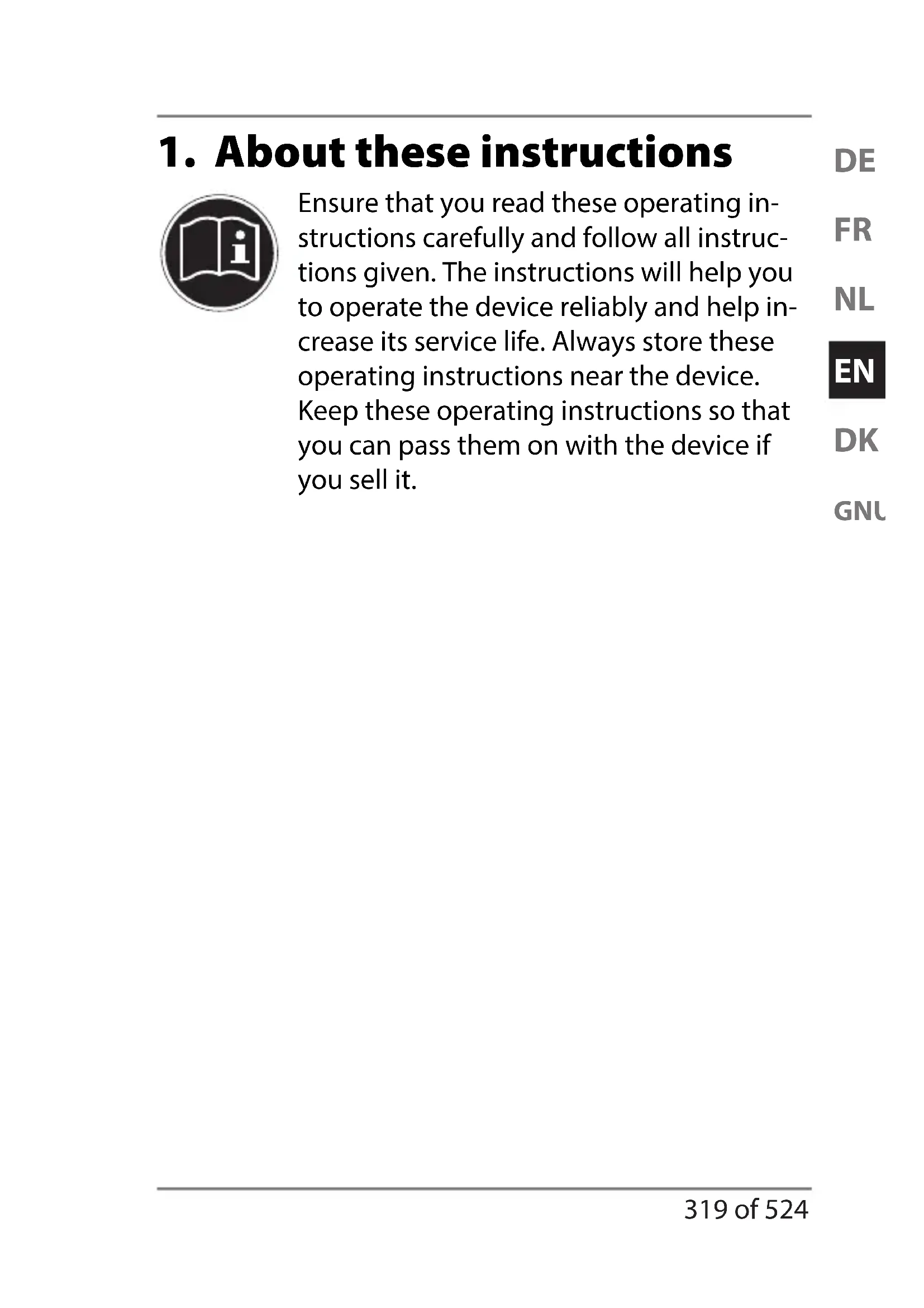 Ensure that you read these operating in- structions carefully and follow all instruc- tions given. The instructions will help you to operate the device reliably and help in- crease its service life. Always store these operating instructions near the device. Keep these operating instructions so that you can pass them on with the device if you sell it. Ecom ML final REV2.indb 319Ecom ML final REV2.indb 319 07.03.2016 10:21:5507.03.2016 10:21:55320 of 524 1.1. Symbols and key words used in these instructions DANGER!