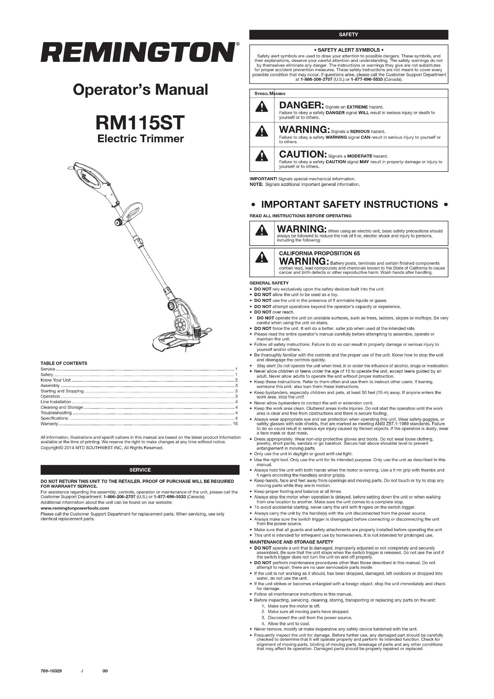 - Never allow children or teens under the age of 15 to operate the unit, except teens guided by an adult. Never allow adults to operate the unit without proper instruction.• Keep these instructions. Refer to them often and use them to instruct other users. If loaning someone this unit, also loan them these instructions.• Keep bystanders, especially children and pets, at least 50 feet (15 m) away. If anyone enters the work area, stop the unit!• Never allow bystanders to contact the unit or extension cord.• Keep the work area clean. Cluttered areas invite injuries. Do not start the operation until the work area is clear and free from obstructions and there is secure footing.• Always wear appropriate eye and ear protection when operating this unit. Wear safety goggles, or safety glasses with side shields, that are marked as meeting ANSI Z87.1-1989 standards. Failure to do so could result in serious eye injury caused by thrown objects. If the operation is dusty, wear a face mask or dust mask. • Dress appropriately. Wear non-slip protective gloves and boots. Do not wear loose clothing, jewelry, short pants, sandals or go barefoot. Secure hair above shoulder level to prevent entanglement in moving parts.• Only use the unit in daylight or good artifi cial light.• Use the right tool. Only use the unit for its intended purpose. Only use the unit as described in this manual. • Always hold the unit with both hands when the motor is running. Use a fi rm grip with thumbs and fi ngers encircling the handle(s) and/or grip(s). • Keep hands, face and feet away from openings and moving parts. Do not touch or try to stop any moving parts while they are in motion. • Keep proper footing and balance at all times.• Always stop the motor when operation is delayed, before setting down the unit or when walking from one location to another. Make sure the unit comes to a complete stop.• To avoid accidental starting, never carry the unit with fi ngers on the switch trigger. • Always carry the unit by the handle(s) with the unit disconnected from the power source. • Always make sure the switch trigger is disengaged before connecting or disconnecting the unit from the power source. • Make sure that all guards and safety attachments are properly installed before operating the unit.• This unit is intended for infrequent use by homeowners. It is not intended for prolonged use. MAINTENANCE AND STORAGE SAFETY• DO NOT operate a unit that is damaged, improperly adjusted or not completely and securely assembled. Be sure that the unit stops when the switch trigger is released. Do not use the unit if the switch trigger does not turn the unit on and off properly. • DO NOT perform maintenance procedures other than those described in this manual. Do not attempt to repair; there are no user serviceable parts inside.• If the unit is not working as it should, has been dropped, damaged, left outdoors or dropped into water, do not use the unit. • If the unit strikes or becomes entangled with a foreign object, stop the unit immediately and check for damage.• Follow all maintenance instructions in this manual.• Before inspecting, servicing, cleaning, storing, transporting or replacing any parts on the unit:1. Make sure the motor is off. 2. Make sure all moving parts have stopped.3. Disconnect the unit from the power source.4. Allow the unit to cool.• Never remove, modify or make inoperative any safety device furnished with the unit.• Frequently inspect the unit for damage. Before further use, any damaged part should be carefully checked to determine that it will operate properly and perform its intended function. Check for alignment of moving parts, binding of moving parts, breakage of parts and any other conditions that may affect its operation. Damaged parts should be properly repaired or replaced. RM115ST Electric Trimmer
