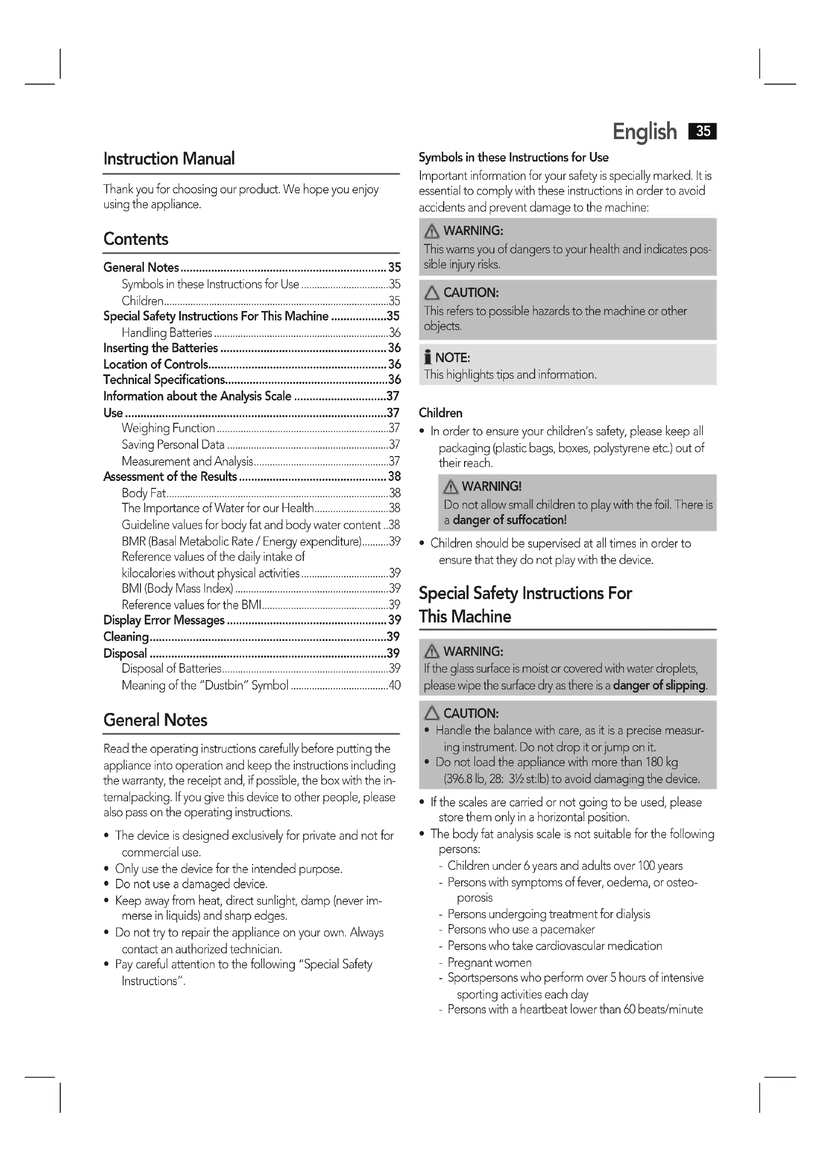 - The body fat analysis scale is not suitable for the following persons: - Children under 6 years and adults over 100 years - Persons with symptoms of fever, oedema, or osteo- porosis - Persons undergoing treatment for dialysis - Persons who use a pacemaker - Persons who take cardiovascular medication - Pregnant women - Sportspersons who perform over 5 hours of intensive sporting activities each day - Persons with a heartbeat lower than 60 beats/minuteEnglish
