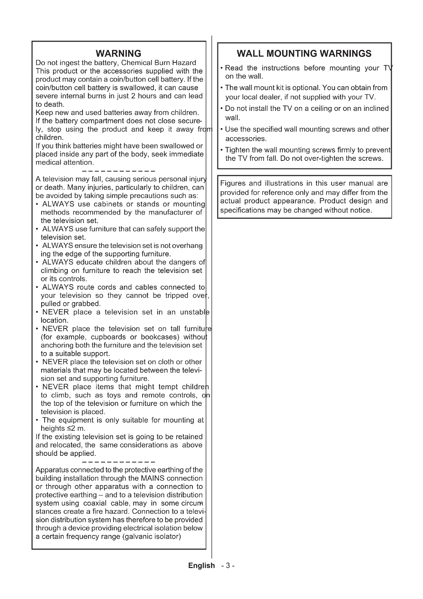 ly, stop using the product and keep it away from children. If you think batteries might have been swallowed or placed inside any part of the body, seek immediate medical attention. – – – – – – – – – – – – A television may fall, causing serious personal injury or death. Many injuries, particularly to children, can be avoided by taking simple precautions such as: